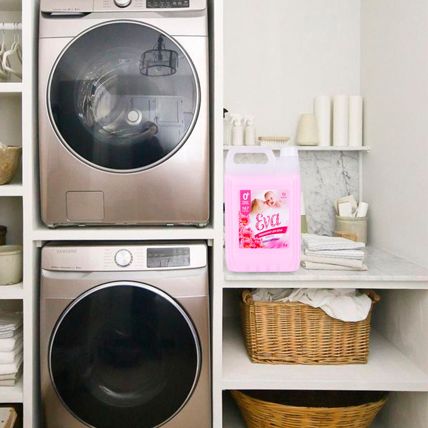 Состав: 30% очищенная вода; 5%, 15% катионные ПАВ; 5%: неионогенные ПАВ, глицерин, ароматизирующие добавки (в т.ч. бензилбензоат, линалол, гераниол), метилхлороизоциазолинон, метилизоциазолинон, краситель. Кондиционер-ополаскиватель для белья 5 л GRASS "EVA" sensitive, концентрированный, 125376