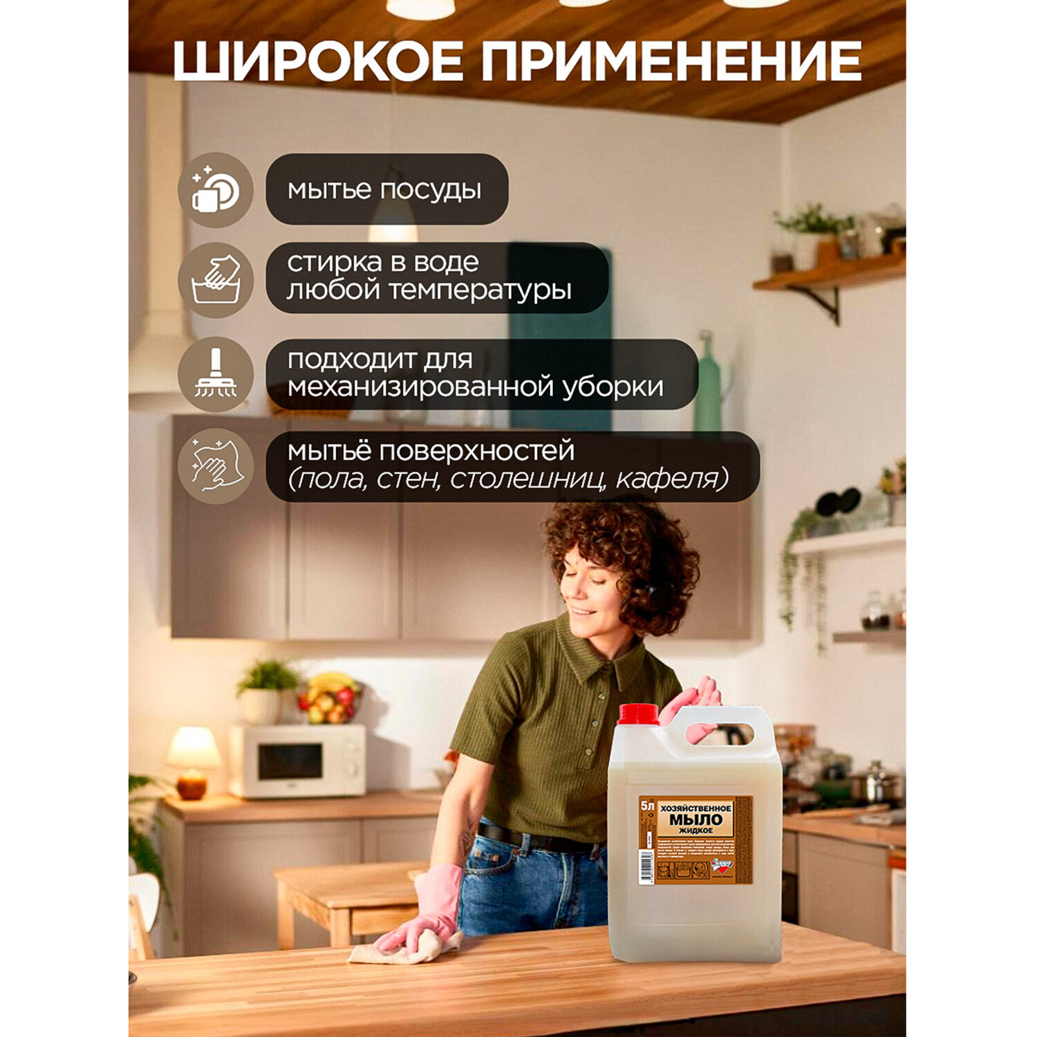 Хозяйственное мыло жидкое t;Золушкаt; в формате 5 л является универсальным средством для уборки (бытовая химия для дома). Его можно применять как мыло для рук, гель для стирки, моющее для посуды и кухни. Канистра 5 литров позволит долго использовать мыло, при этом экономить средства за счет универсальности и небольшого расхода продукта.
