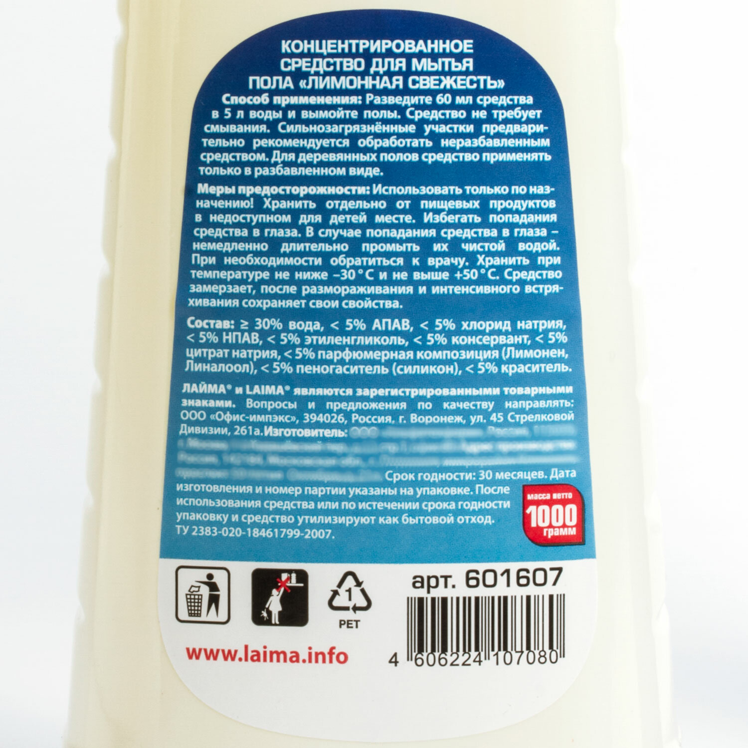 Состав: вода, 5% АПАВ, НПАВ (менее 5%), этиленгликоль, натрий хлористый, цитрат натрия, силикон, парфюмерная композиция, консервант, краситель. Средство для мытья пола 1 кг, LAIMA PROFESSIONAL концентрат, "Лимон", 601607