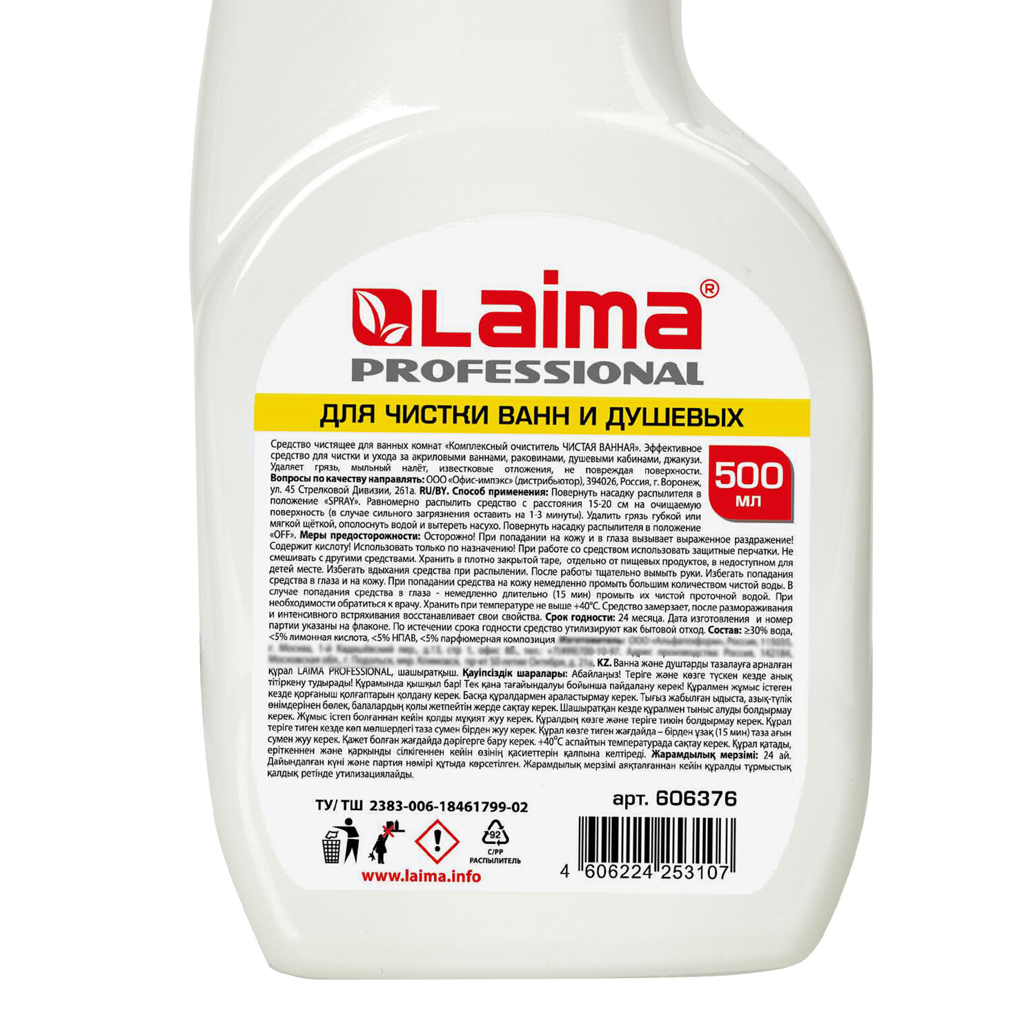 - Средство для чистки ванн и душевых 500 мл LAIMA PROFESSIONAL, распылитель, 606376