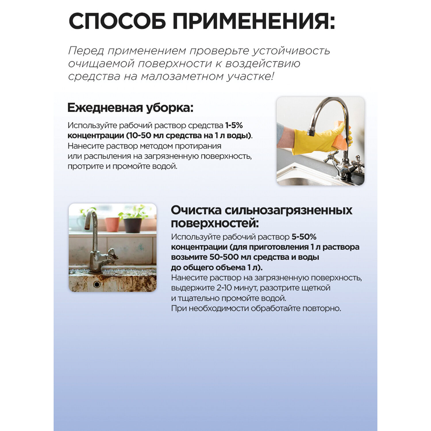 Используйте готовое средство или рабочий раствор 5-30% концентрации (50-450 мл средства на 1 л воды). Нанести раствор на загрязненную поверхность, выдержите 2-10 минут, при необходимости разотрите щеткой или обработайте повторно. После применения тщательно промойте водой.