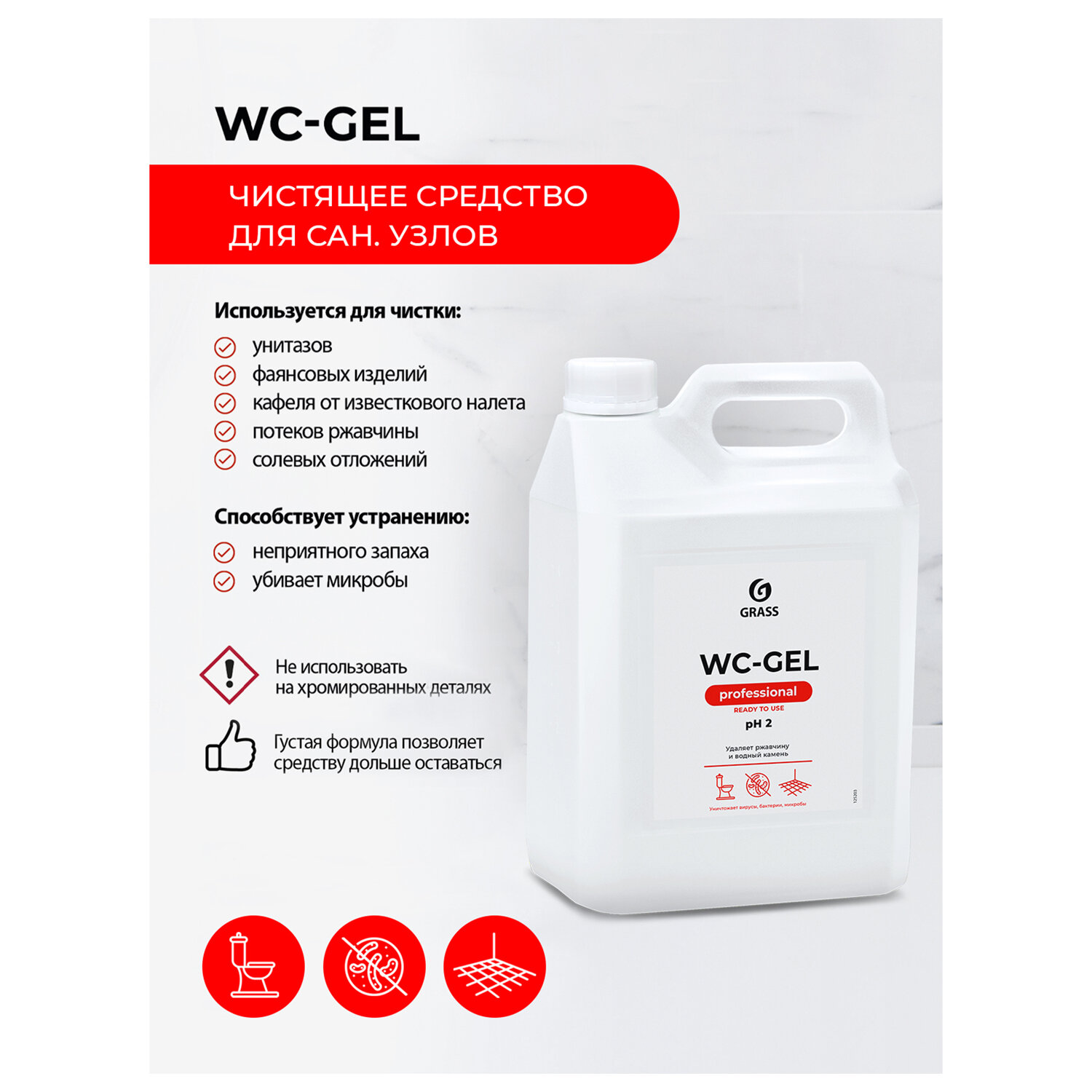 Состав: более или равно 30% очищенная вода; менее 5%: соляная кислота, неионогенные ПАВ, ароматизирующая добавка, краситель. Средство для уборки сантехнических блоков 5,3 кг GRASS WC-GEL, кислотное, гель, 125203