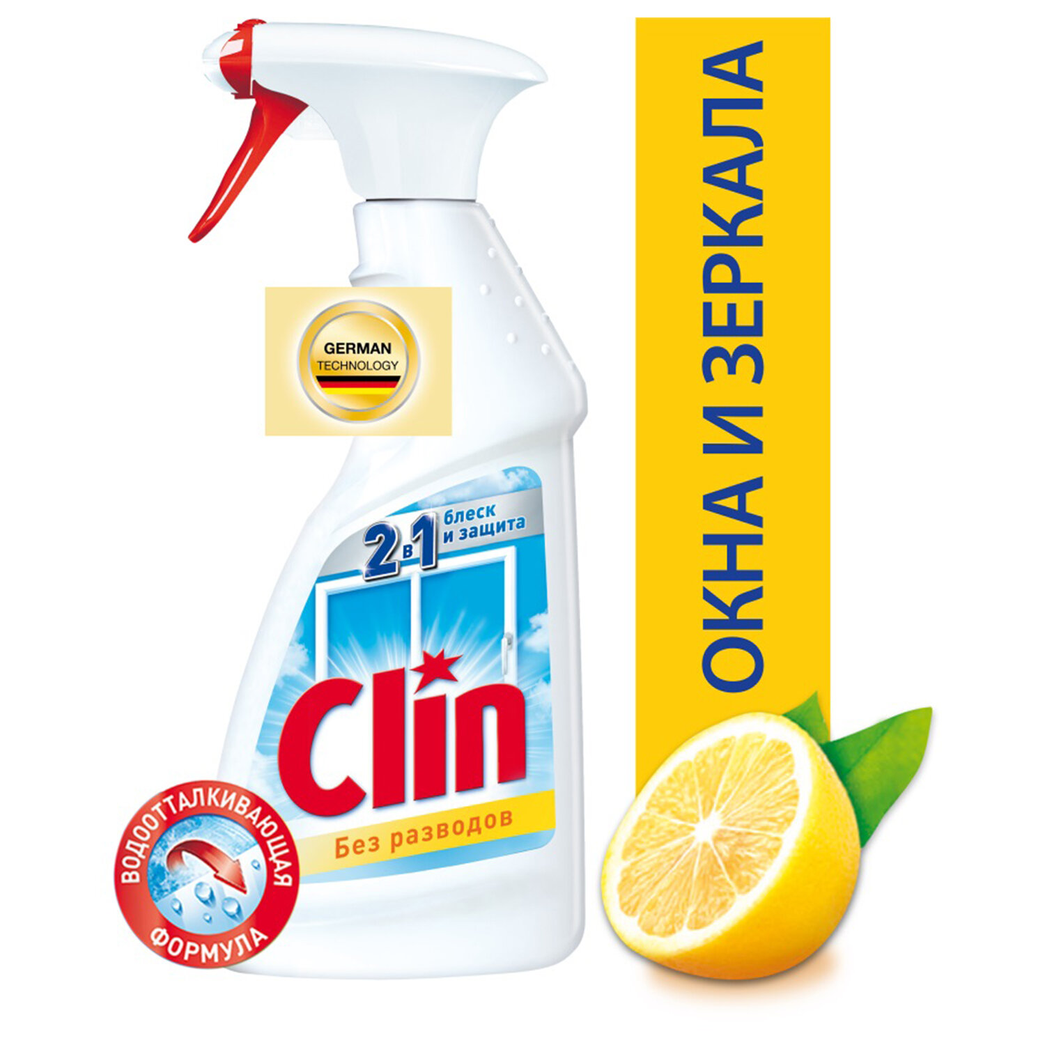 КЛИН 2 в 1 t;Блеск и Чистотаt; с водоотталкивающей формулой – средство для мытья окон, зеркал и стеклянных поверхностей, обеспечивает блеск и сияние без разводов.