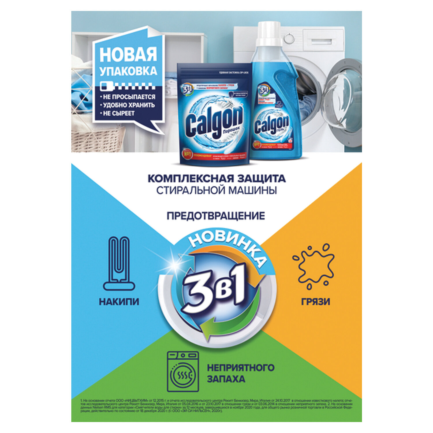 - CALGON предотвращает появление неприятного запаха в стиральной машине.