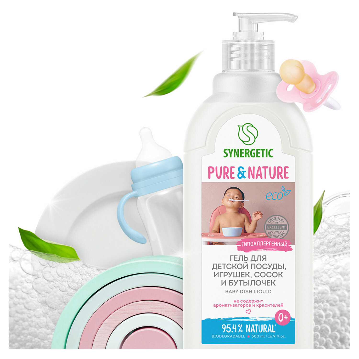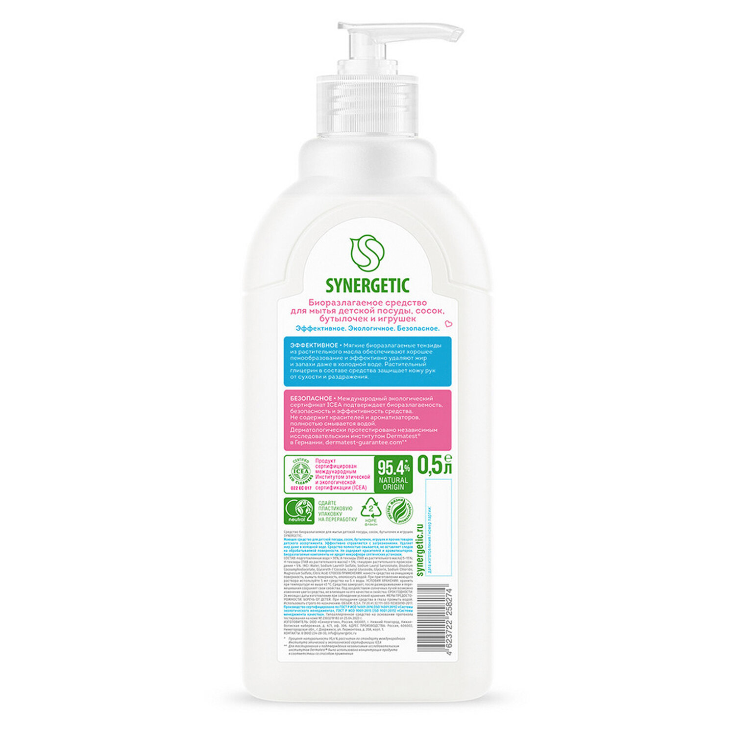 - Гель для мытья детской посуды 500 мл, SYNERGETIC, биоразлагаемый, дозатор, 103054