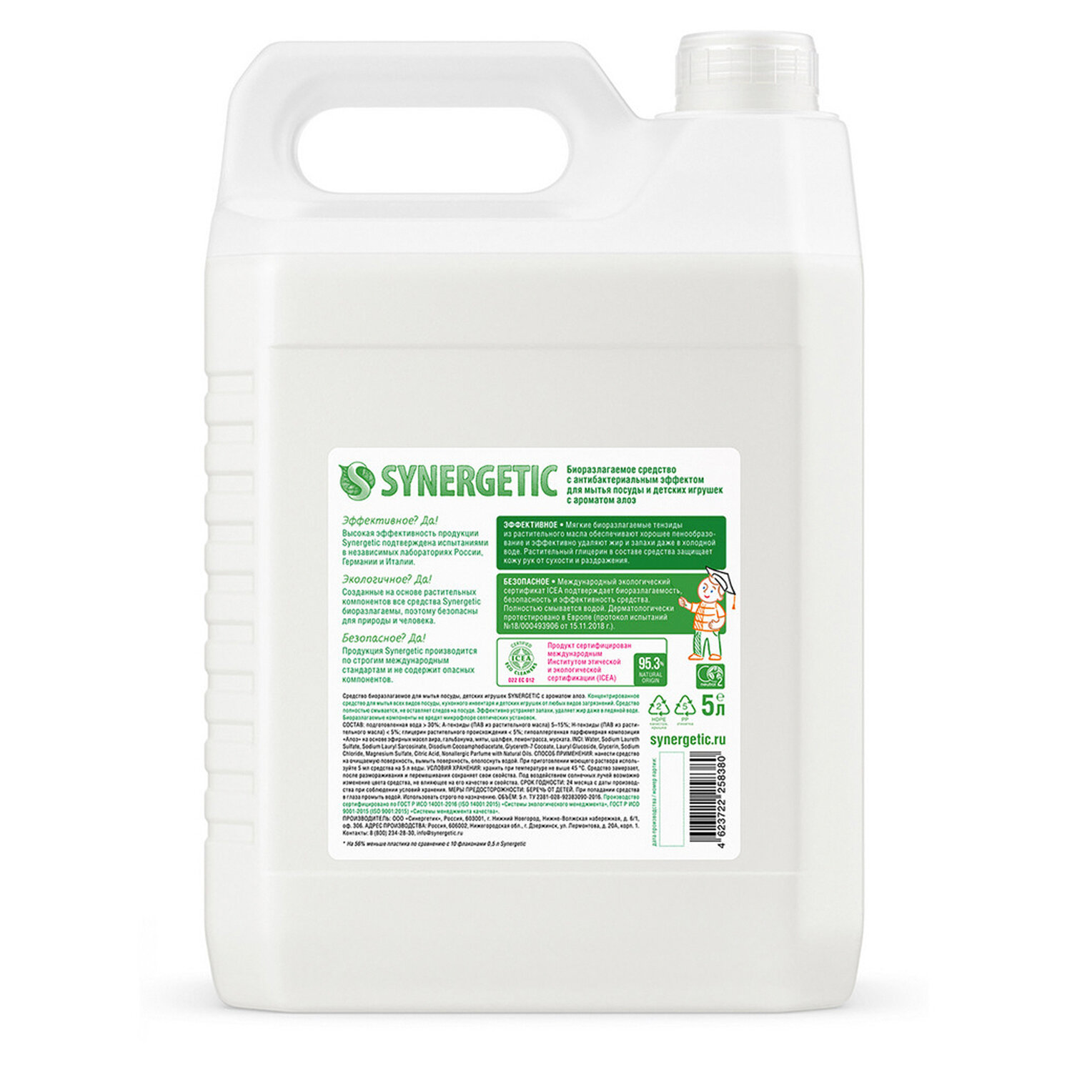 - Гель для мытья посуды антибактериальный 5 л, SYNERGETIC "Алоэ", канистра, 103503