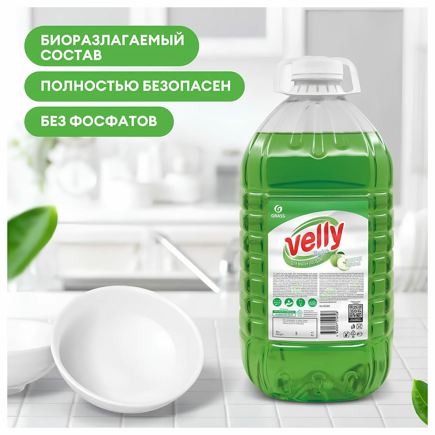 Способ применения: нанести небольшое количество средства на губку, вспенить, вымыть посуду вспененным составом, смыть водой. Средство для мытья посуды 5 кг, GRASS VELLY "Яблоко", концентрат, ПЭТ, 125469