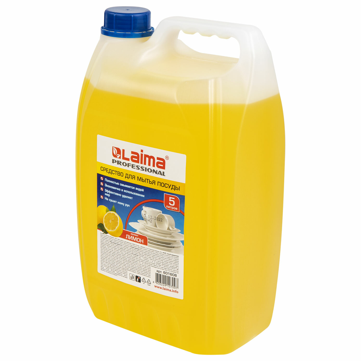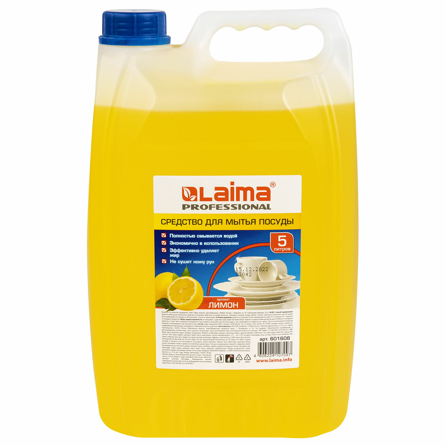 Соответствует ТУ 2383-002-55219799-2011. Средство для мытья посуды 5 л, LAIMA PROFESSIONAL, концентрат, "Лимон", 601608