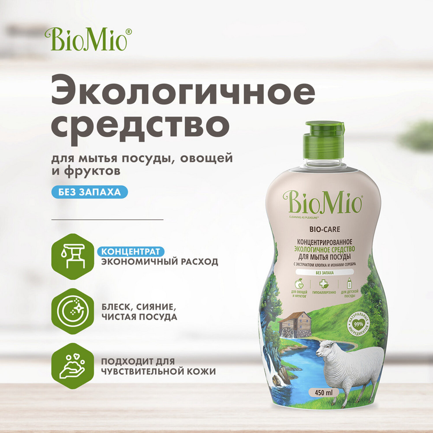 - Средство для мытья посуды, овощей и фруктов 450 мл BIOMIO "Без запаха", 508.04086.1801