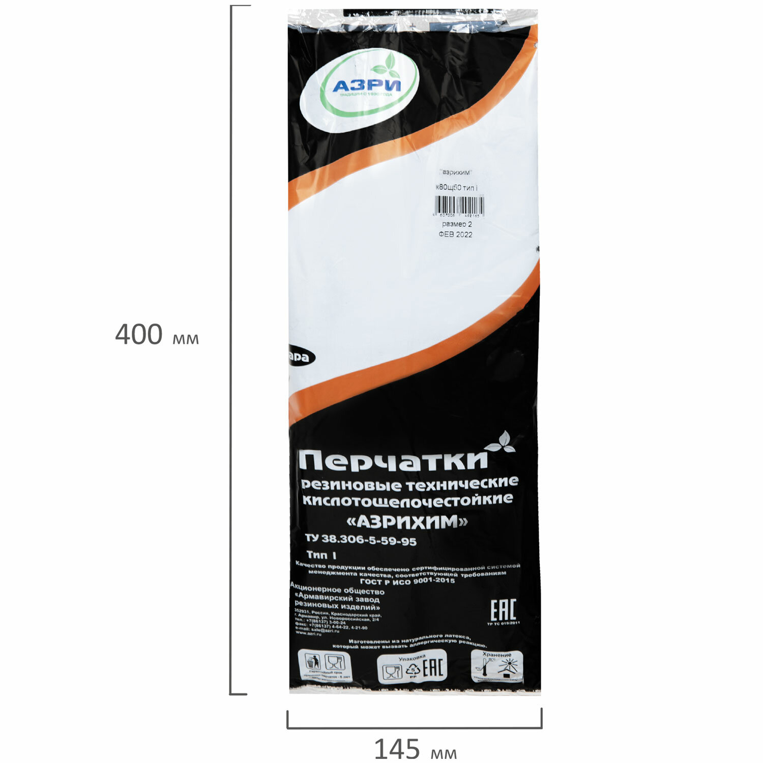 ГОСТ Р 52239-2004 Перчатки резиновые технические кислотощелочестойкие КЩС Тип-1, К80/Щ50, размер 2 (большой), АЗРИ