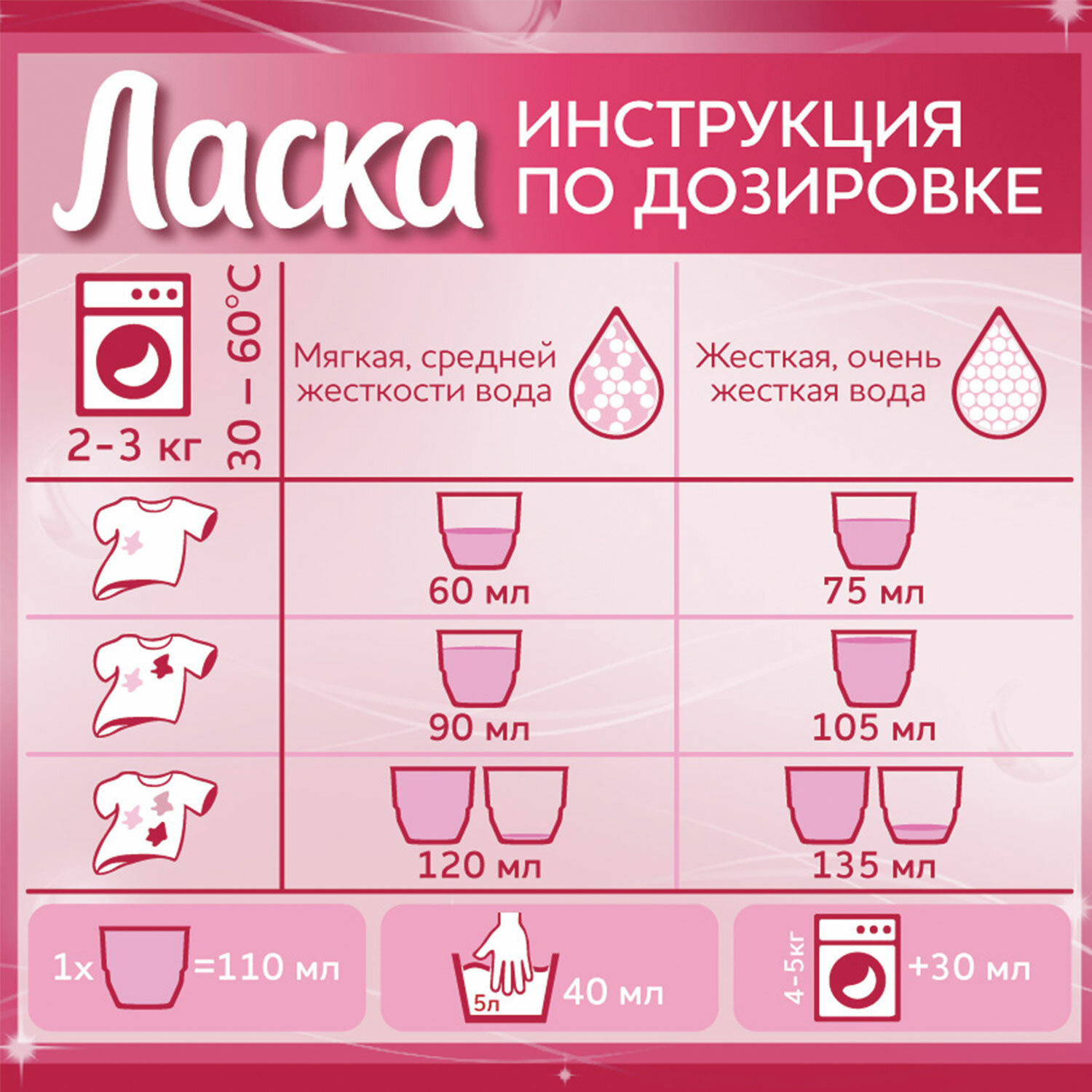 Ласка t;Для Цветногоt; – это средство для стирки одежды ярких цветов. Формула Fibrex-tech* с эффектом восстановления цвета ткани была специально разработана для активного ухода за одеждой и поддержания первозданной красоты Ваших вещей стирка за стиркой. Она не только бережно отстирывает загрязнения, но и отлично заботится о Вашей одежде в двух ключевых направлениях: