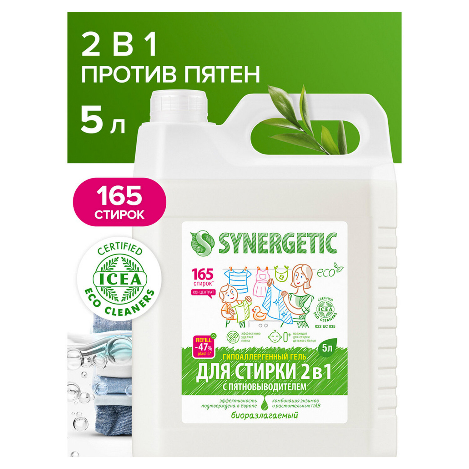- стирать новые цветные вещи отдельно. Гель для стирки с пятновыводителем для всех видов тканей 5 л SYNERGETIC "2 в 1", гипоаллергенный, 109804