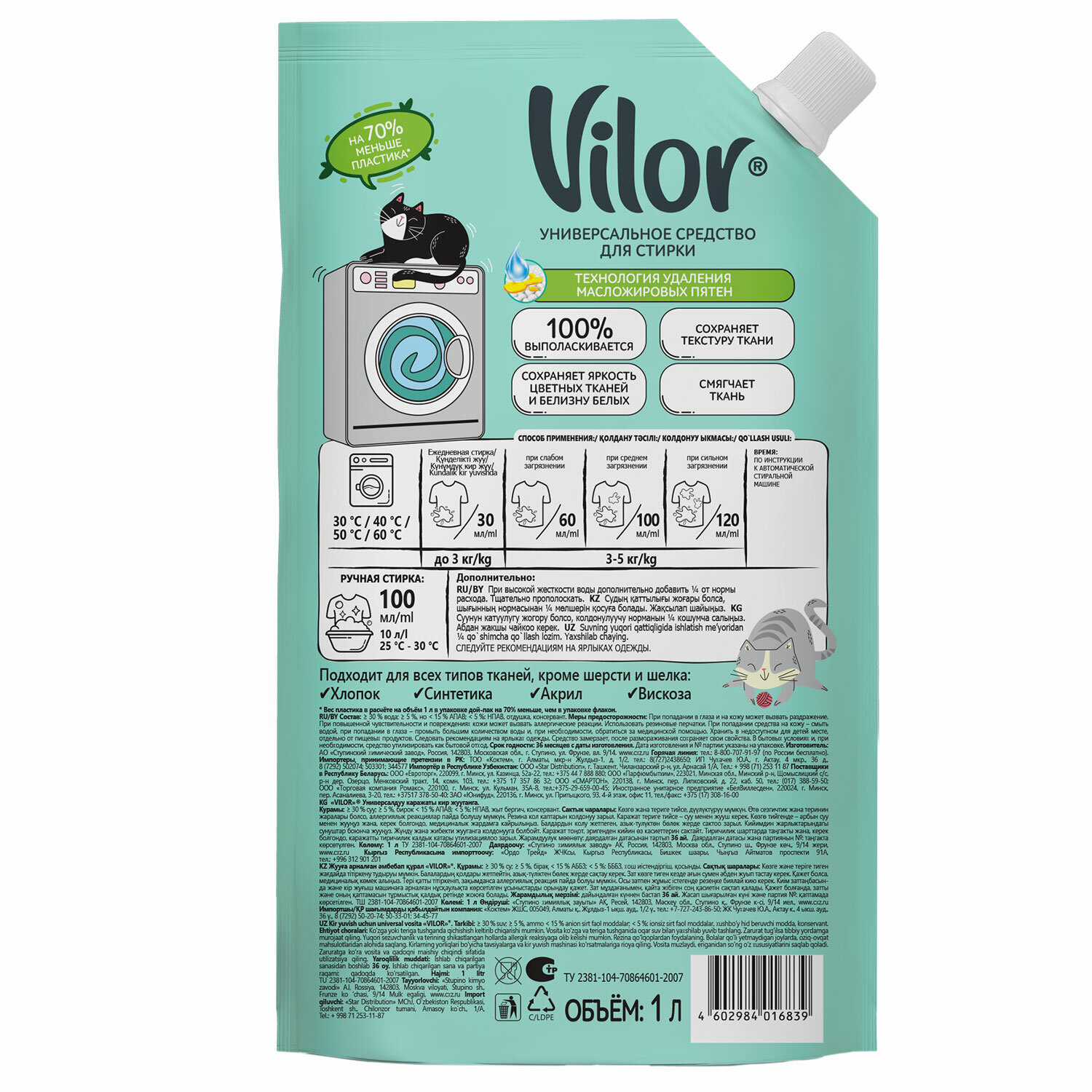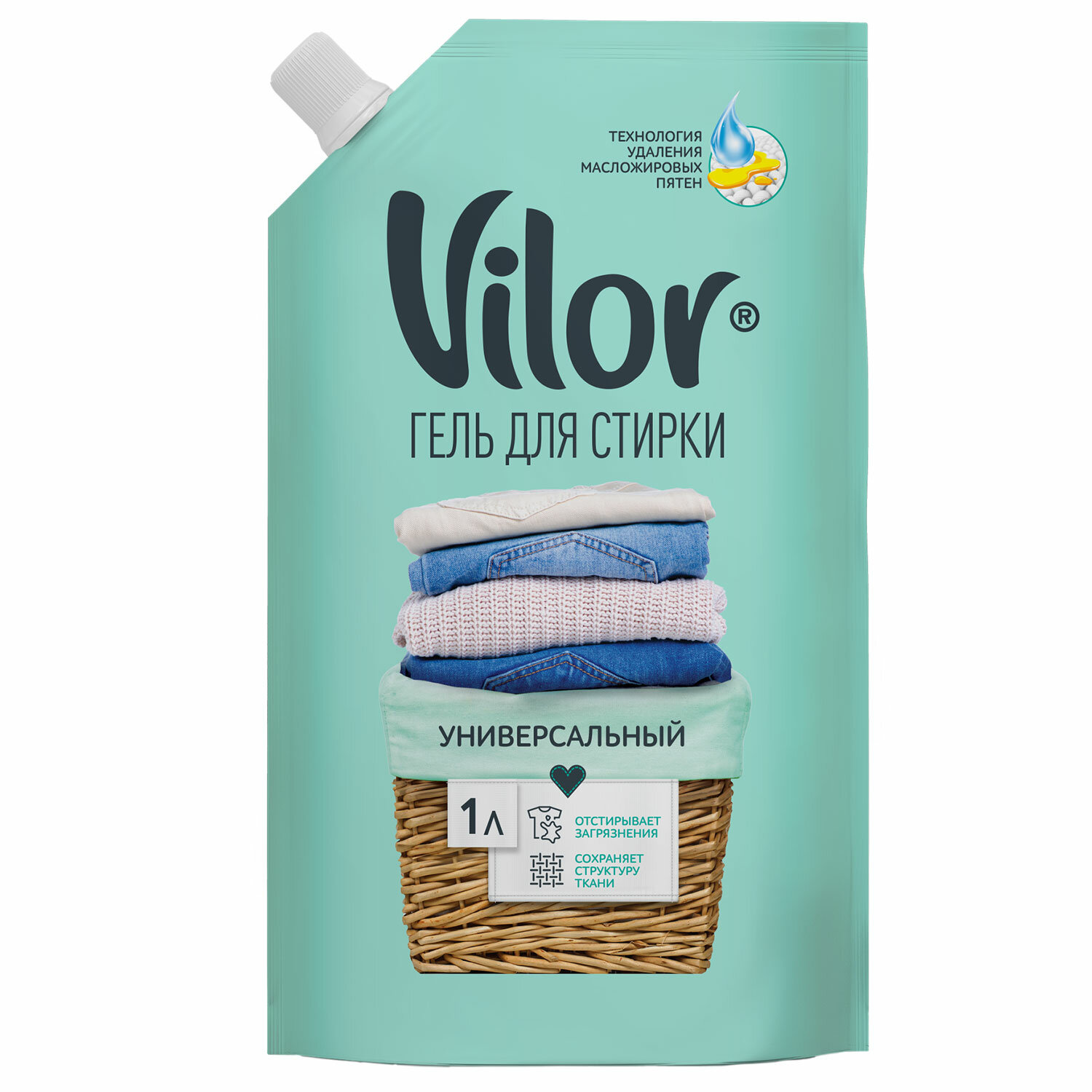 Объём колпачка ~ 40 мл Гель для стирки универсальный 1000 г, VILOR для всех видов тканей, 15539