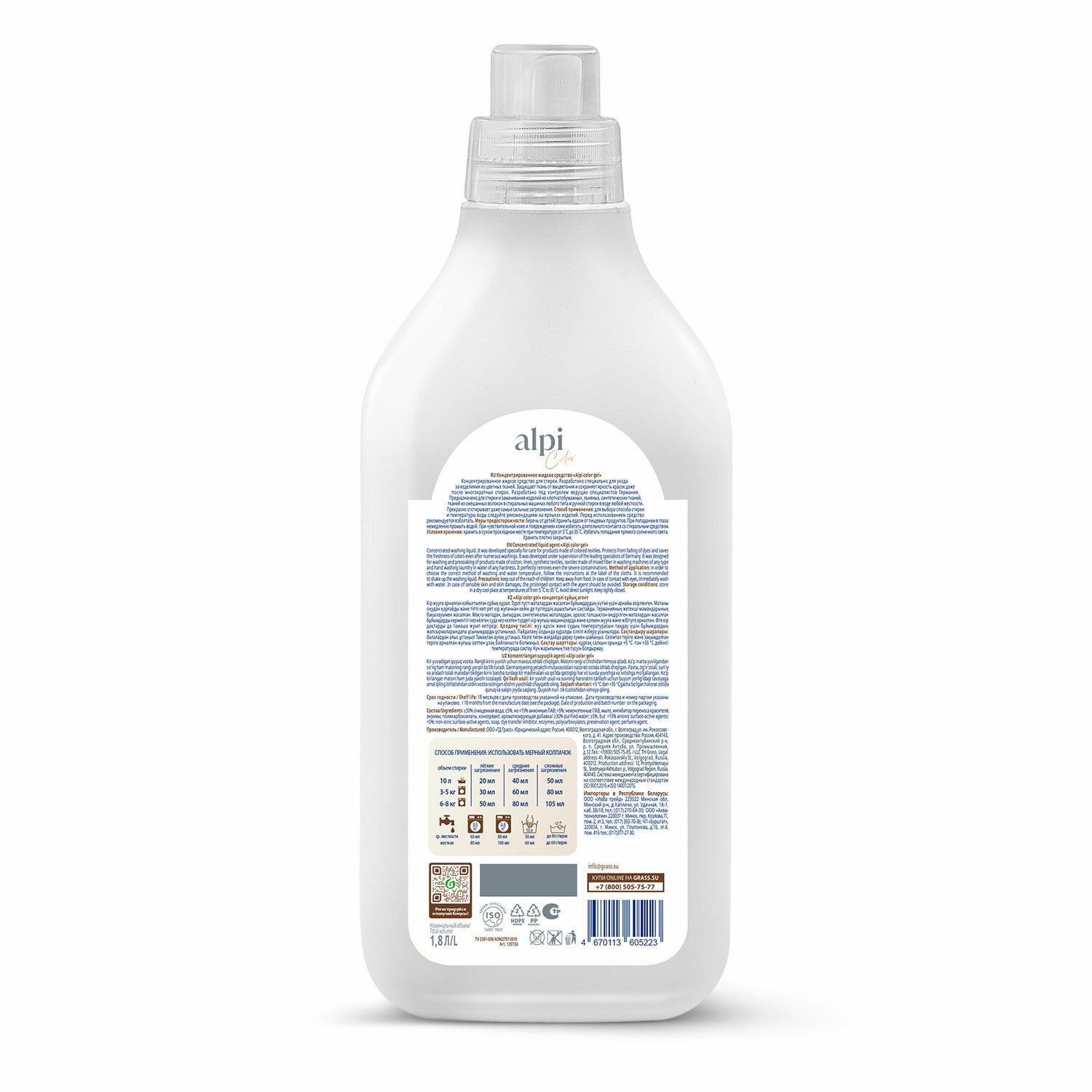 - Средство для стирки жидкое 1,8 л, GRASS ALPI, для цветных тканей, нейтральное, концентрат, гель, 125734