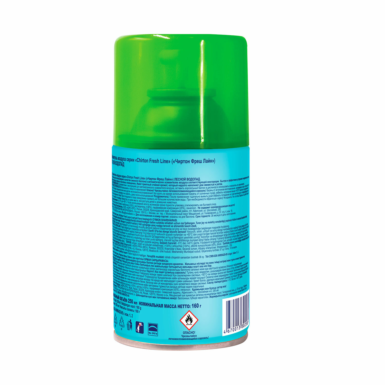 Состав: смесь пропана, бутана и изобутана ( 30%), растворитель ( 5%, но 15%), парфюмерная композиция (;#8804; 5%), линалоол. Сменный баллон 250 мл, CHIRTON "Лесной водопад", для автоматических освежителей, универсальный, сухое распыление, 4670013302581