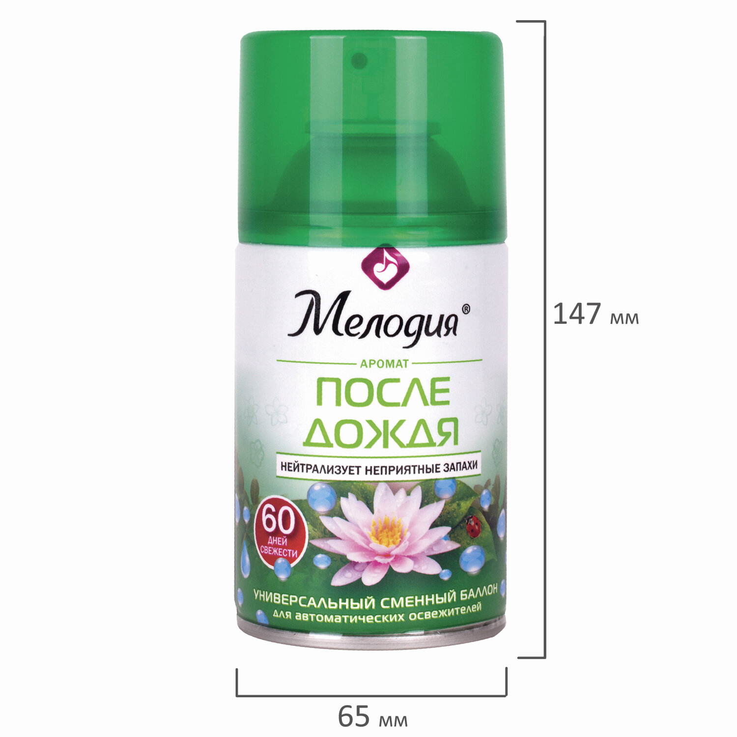 Формула сухого распыления делает аромат более стойким и не оставляет брызг и пятен на полу и мебели, которые могут возникнуть при использовании аэрозолей, помогает быстро избавиться от неприятных запахов. Специальная конструкция распылителя обеспечивает более длительное использование освежителя. Объем картриджа - 250 мл. Сменный баллон 250 мл МЕЛОДИЯ "После дождя", для автоматических освежителей, универсальный, 605227