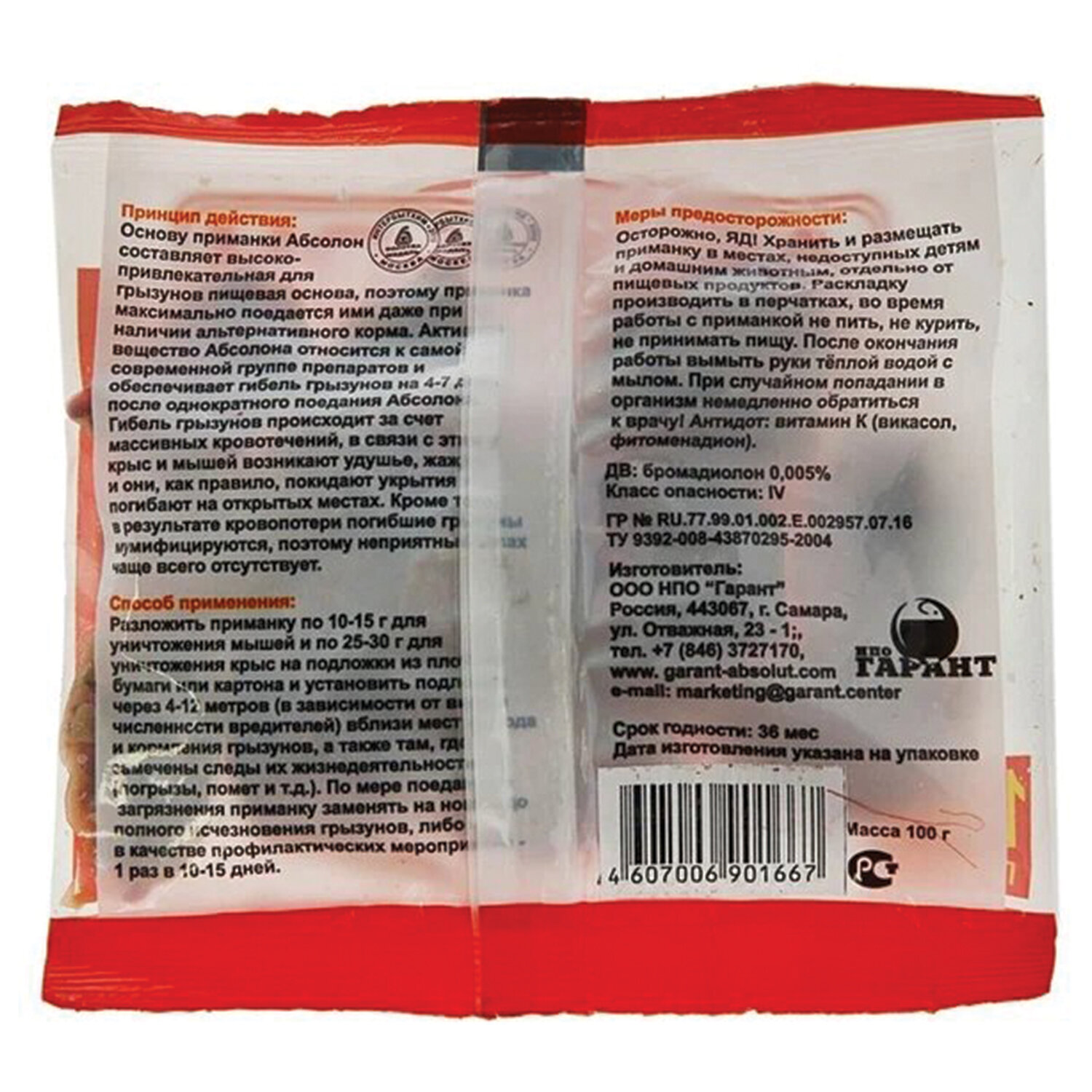 Действующее вещество: бромадиолон 0,005%. Приманка в парафинированных брикетах для уничтожения грызунов мумифицирующая 100 г, АБСОЛОН, АЛБПП100