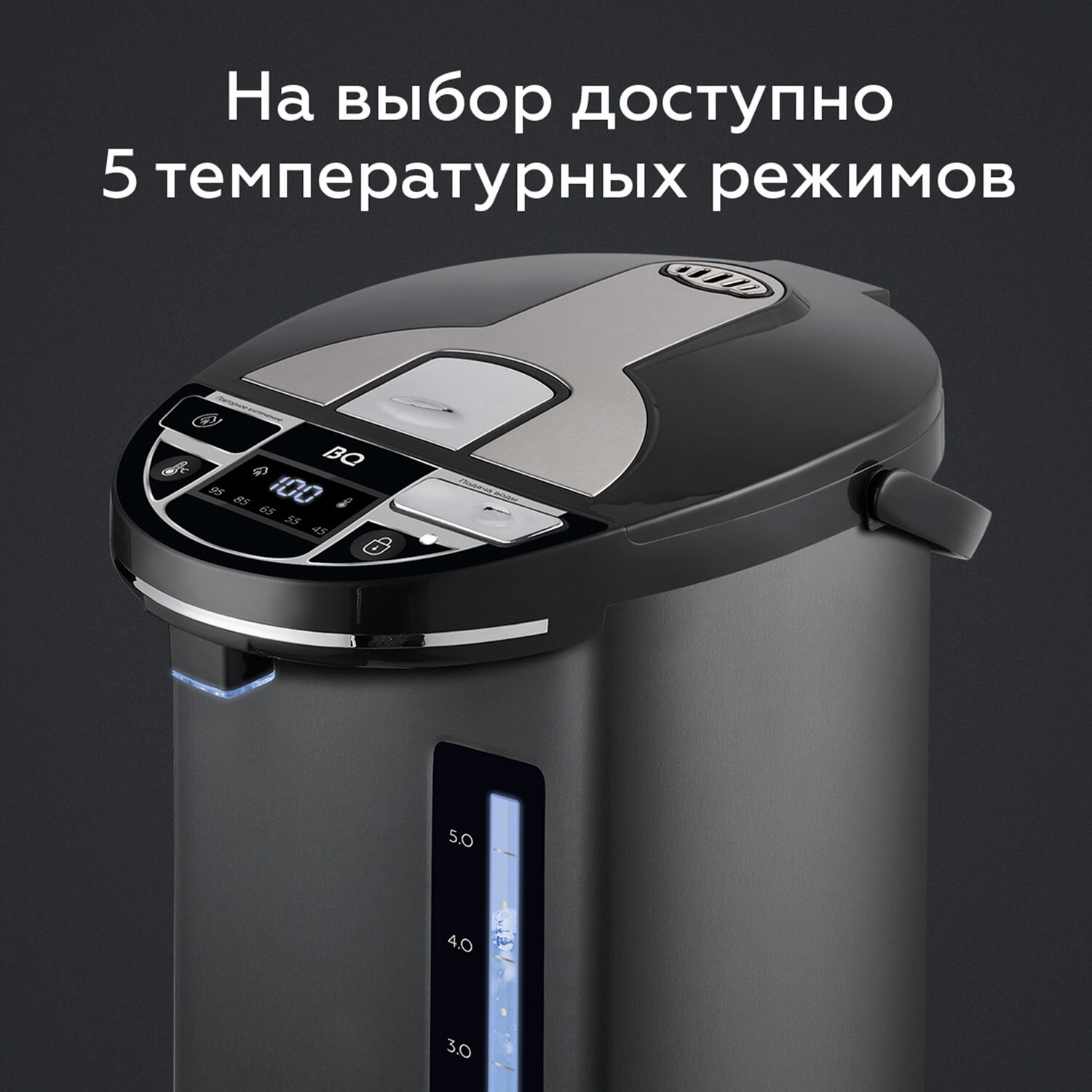 Термопот оснащён LED-дисплеем, который отображает информацию о температуре воды, что облегчает контроль процесса нагрева.