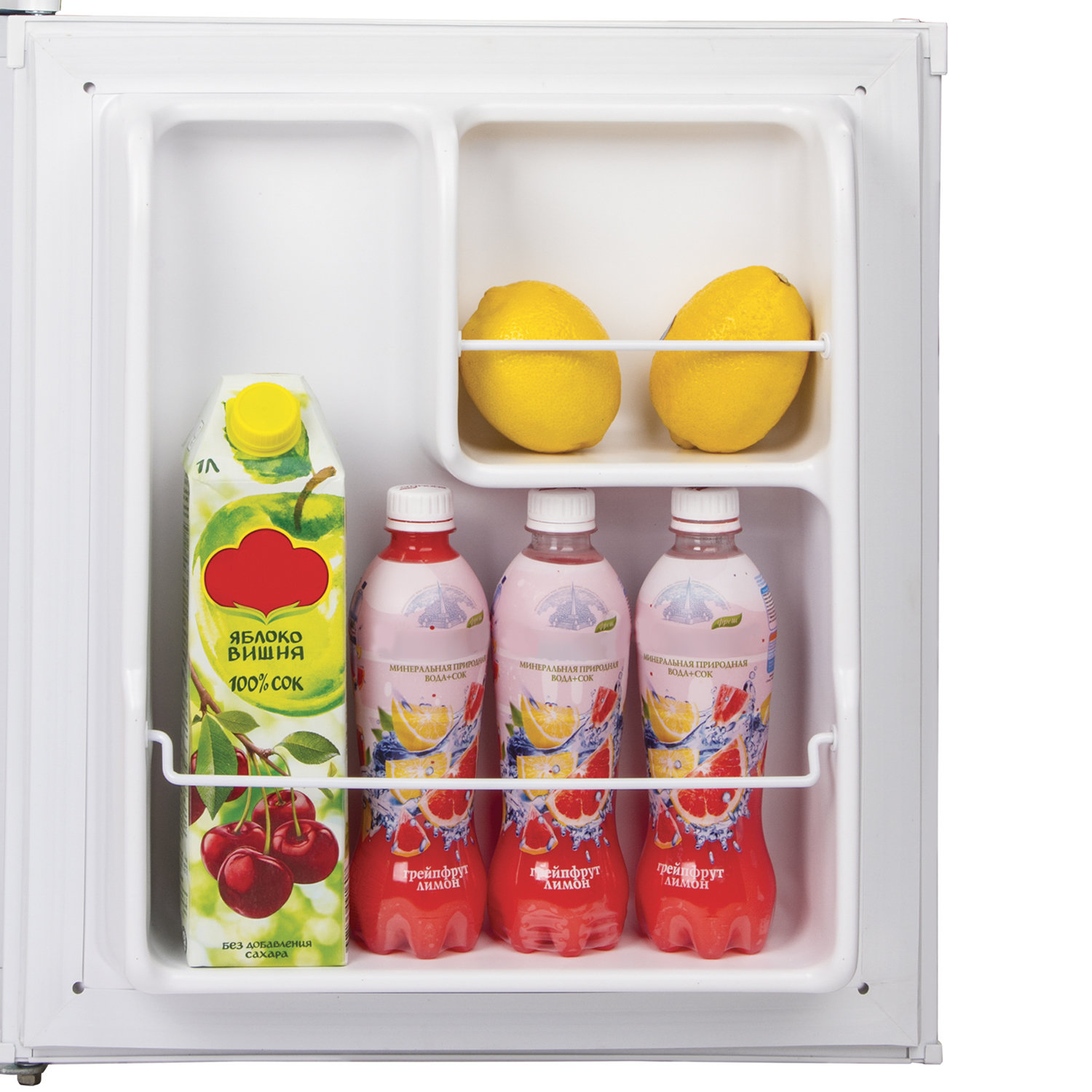 Полезный объем холодильника составляет 43 л. Данная модель включает в себя 2 полки в основное камере, небольшую морозильную камеру и 2 компактные полки в дверце холодильника. В основной камере расположена полочка для хранения продуктов, выполненная из нержавеющей стали. Объем морозильной камеры составляет 4 л, что идеально подходит для нескольких порций мороженого или 2 бутылок воды. Дополнительно в данной модели есть возможность перевешивания двери, инструкция описана в руководстве пользователя.