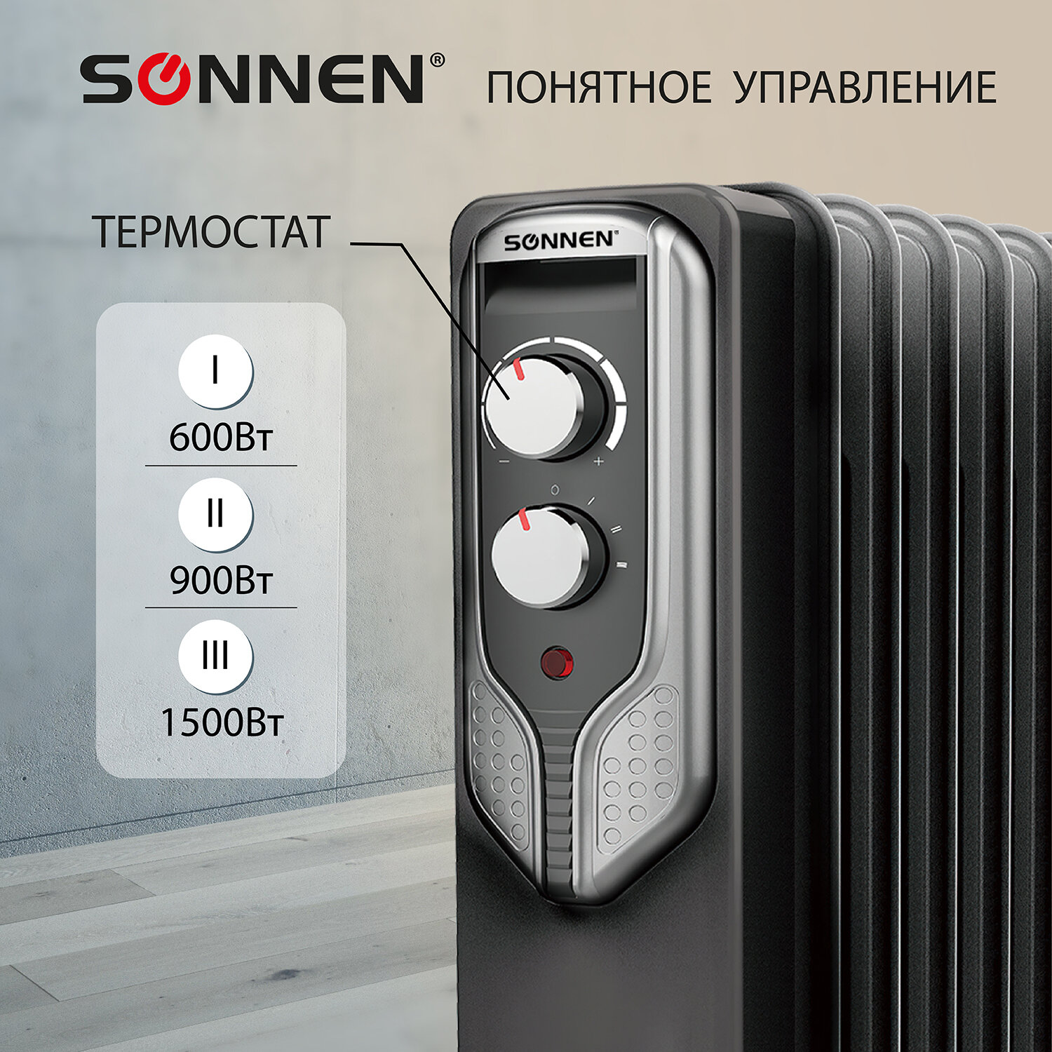 - Обогреватель масляный SONNEN DFN-07BL, 1500 Вт, 7 секций, черный, 455310