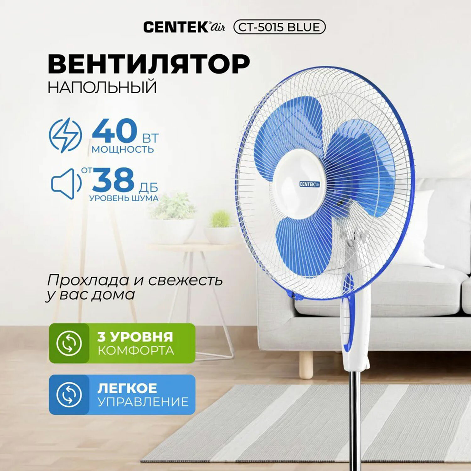 - Вентилятор напольный, 3 режима, CENTEK CT-5015 Blue, d=43 см, 40 Вт, синий