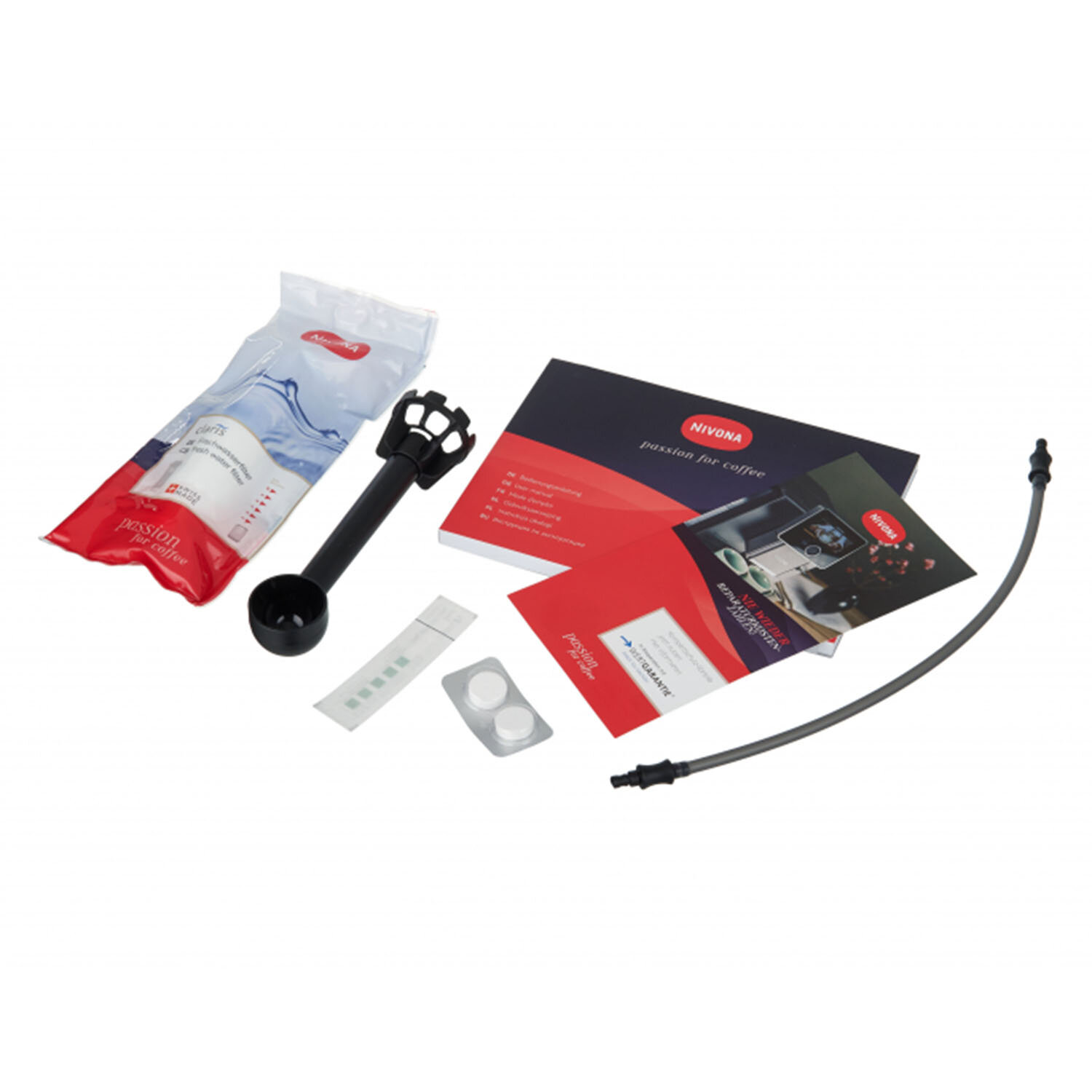 инструкция, мерная ложка, трубка для молока, фильтр для воды, чистящие таблетки
