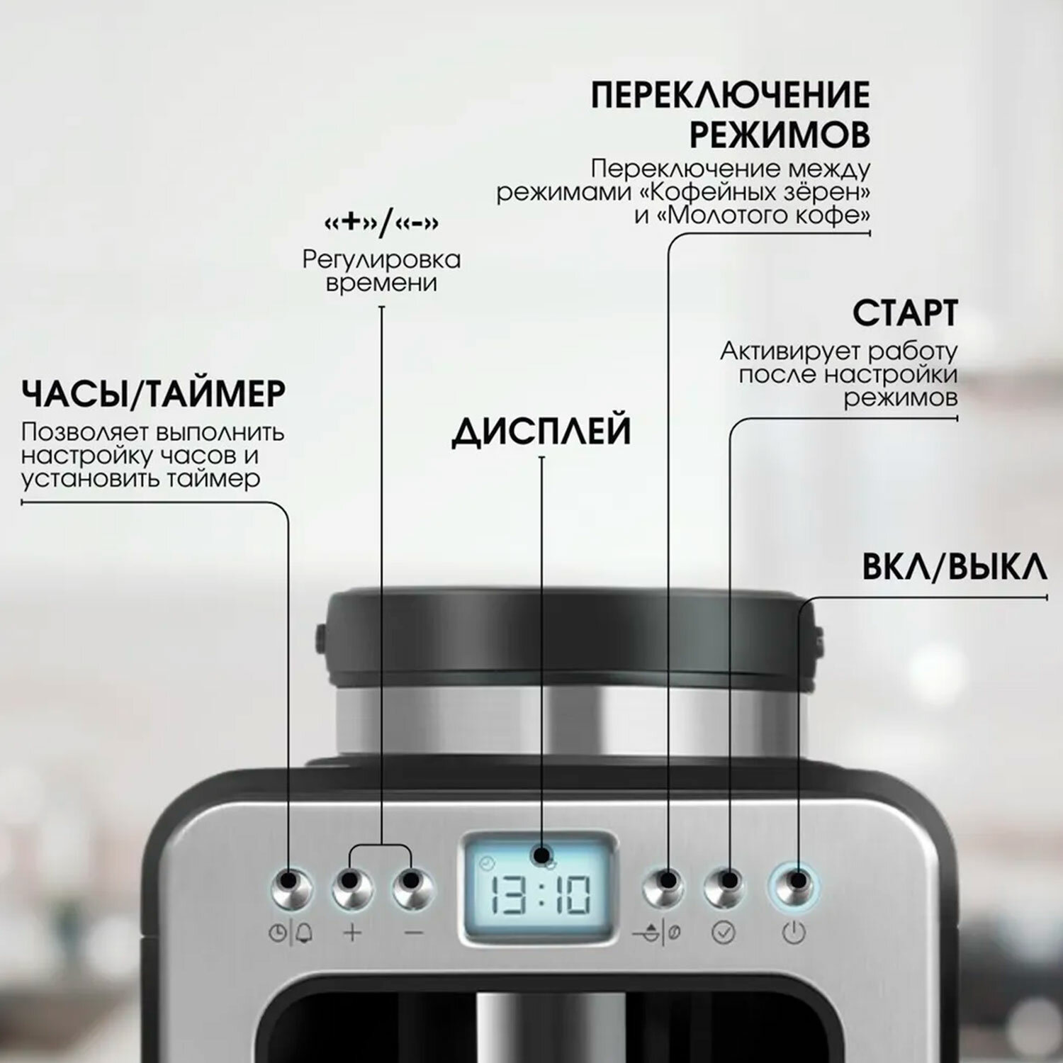 Интуитивно понятные часы и таймер отложенного старта позволят вам задать время приготовления, чтобы наслаждаться свежезаваренным кофе в любое время.