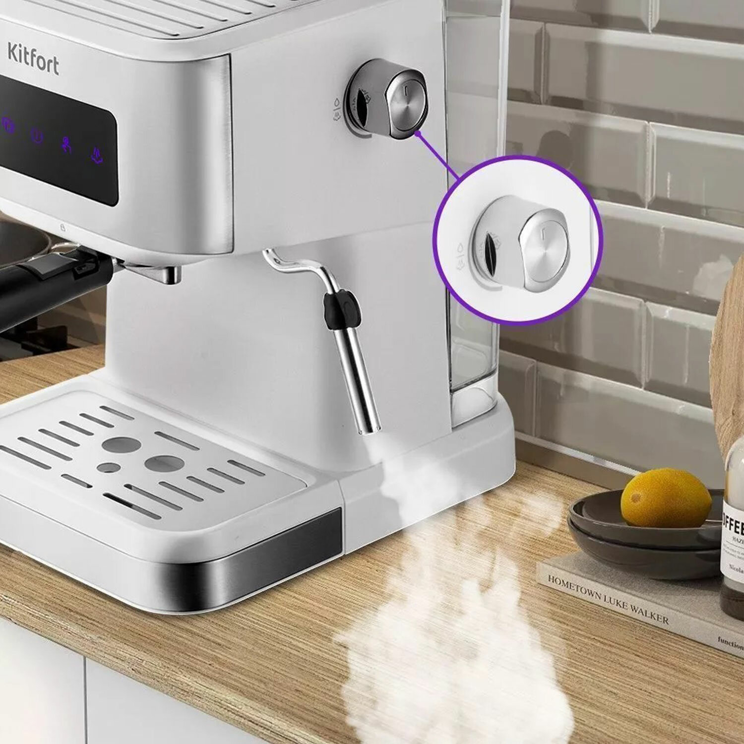 Для подачи пара и горячей воды у КТ-7139 есть паровая трубка – стимер. Стимер погружают в холодное молоко, включают подачу пара и взбивают молочную пенку. С помощью стимера вы также можете подогреть остывший чай или молоко.