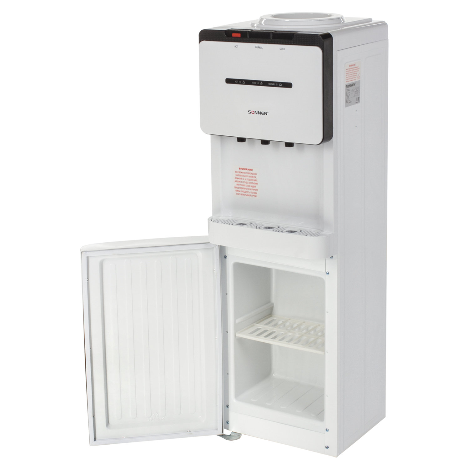 - Кулер для воды SONNEN FSE-03, напольный, НАГРЕВ/ОХЛАЖДЕНИЕ ЭЛЕКТРОННОЕ, шкаф, 3 крана, белый/черный, 453979