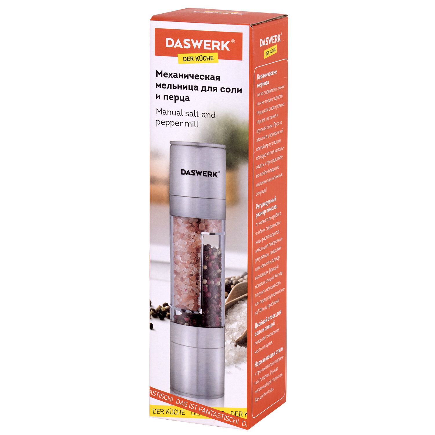 - Механическая мельница для соли и перца 2 в 1, 4 уровня помола, нержавеющая сталь, DASWERK, 456627