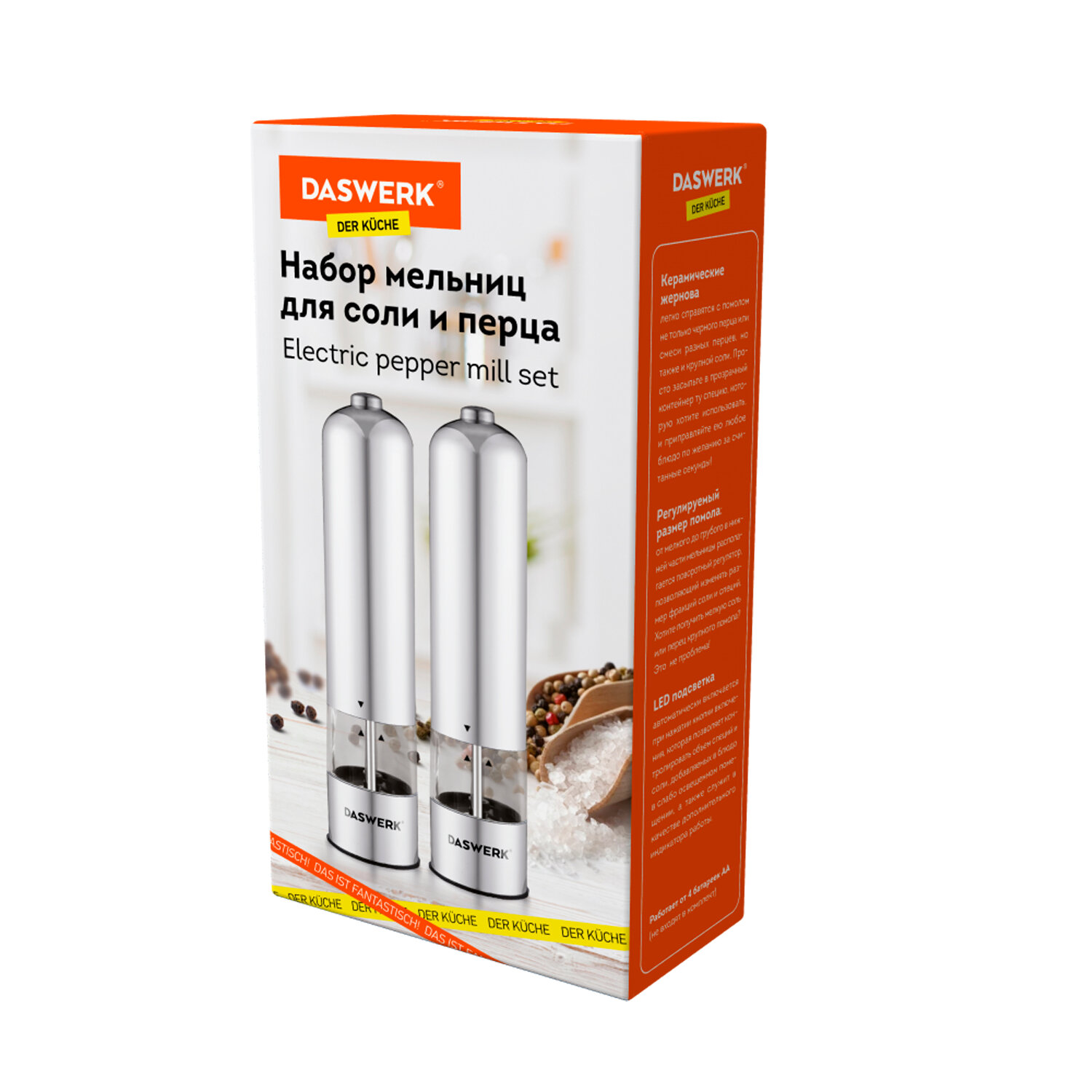 Каждая из мельниц работает от 4 батареек типа АА (в комплект не входят). Набор мельниц для соли и специй электрические с подсветкой, 2 шт., PM-2, DASWERK, 456620