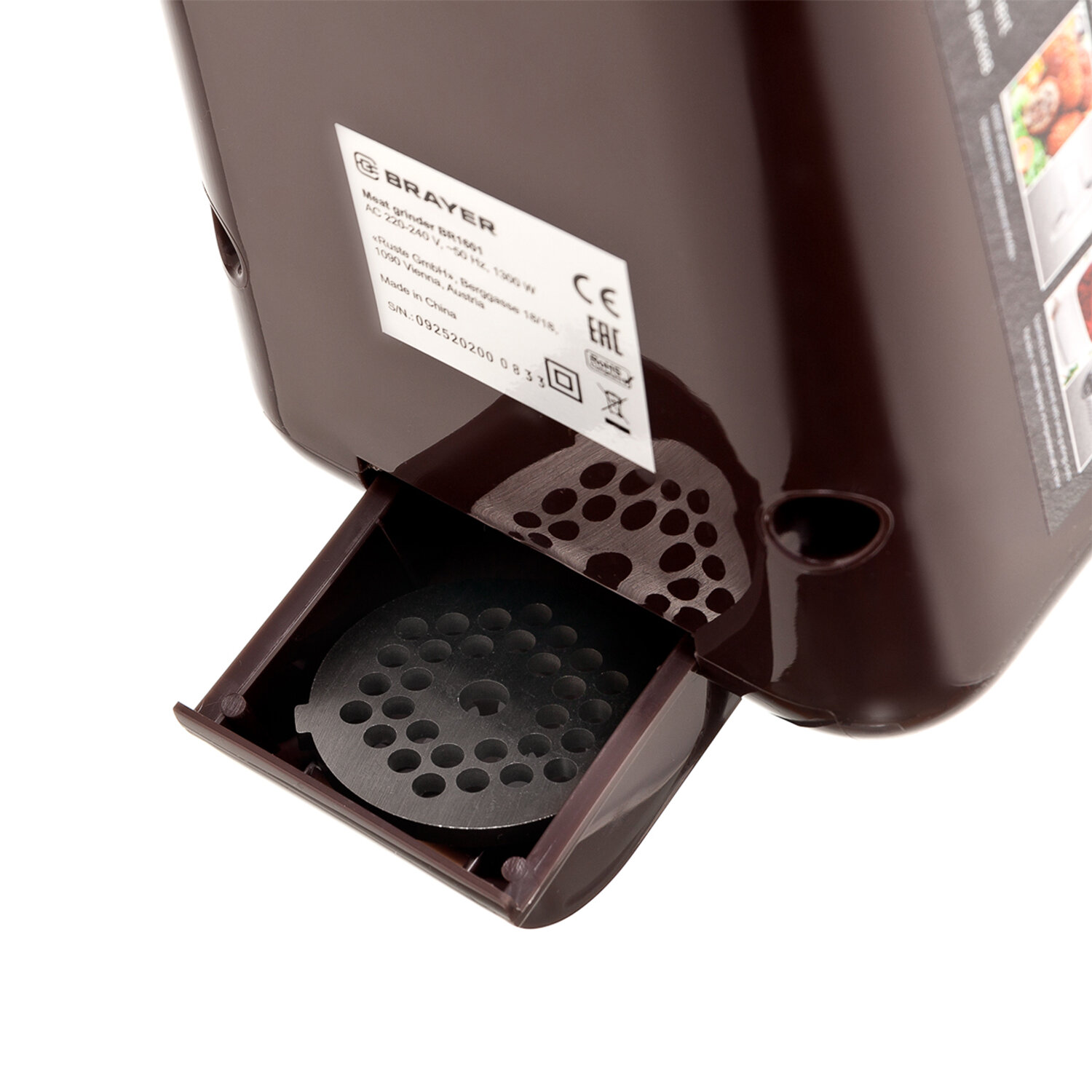Если мясорубка туго перекручивает мясо или иной продукт, можно воспользоваться функцией t;обратный ходt;, чтобы освободить шнек. Мясорубка BRAYER BR1601, 1300 Вт, производительность 1,5 кг/мин, металлический шнек, реверс, пластик, коричневая/серебро