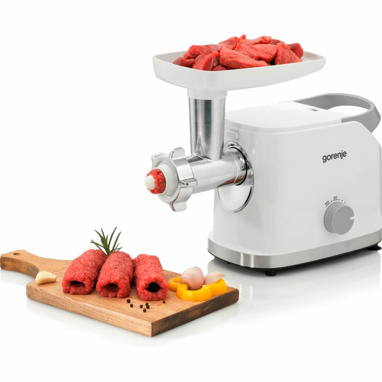 Мясорубка GORENJE MG1802SJW, 1800 Вт, производительность 2,1 кг/мин, 7 насадок, реверс, белый