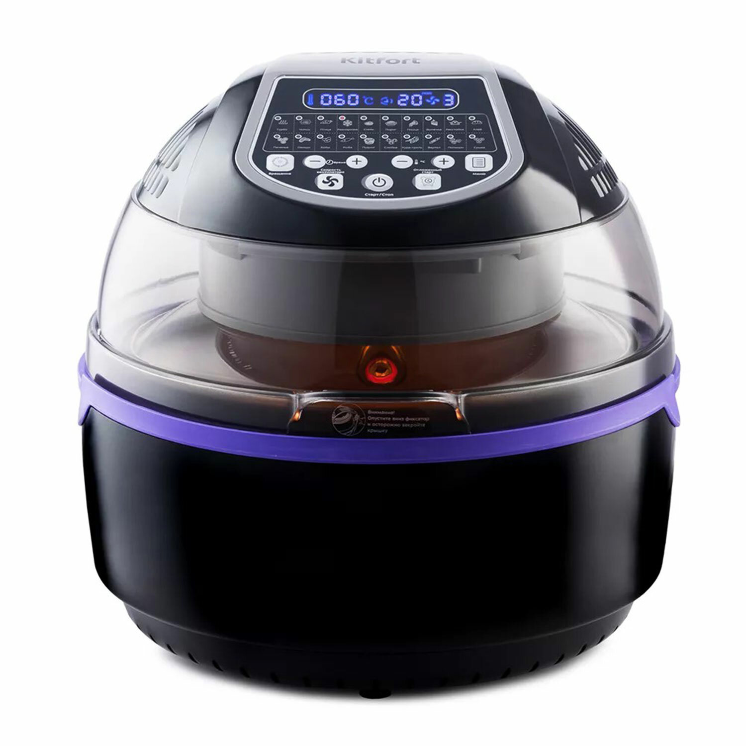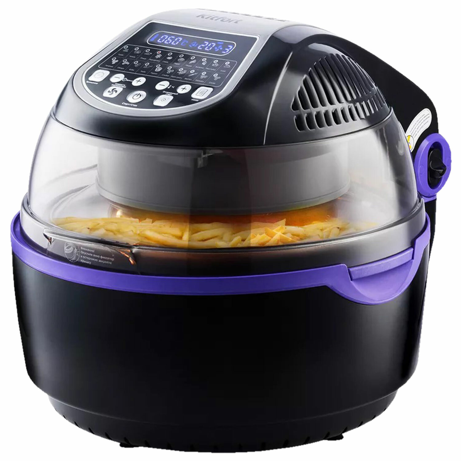 Производитель на свое усмотрение и без дополнительных уведомлений может менять комплектацию, внешний вид, страну производства и технические характеристики модели. Аэрогриль KITFORT КТ-2219-1, 1400 Вт, 8 л, 20 программ, таймер, сенсорное управление, черный