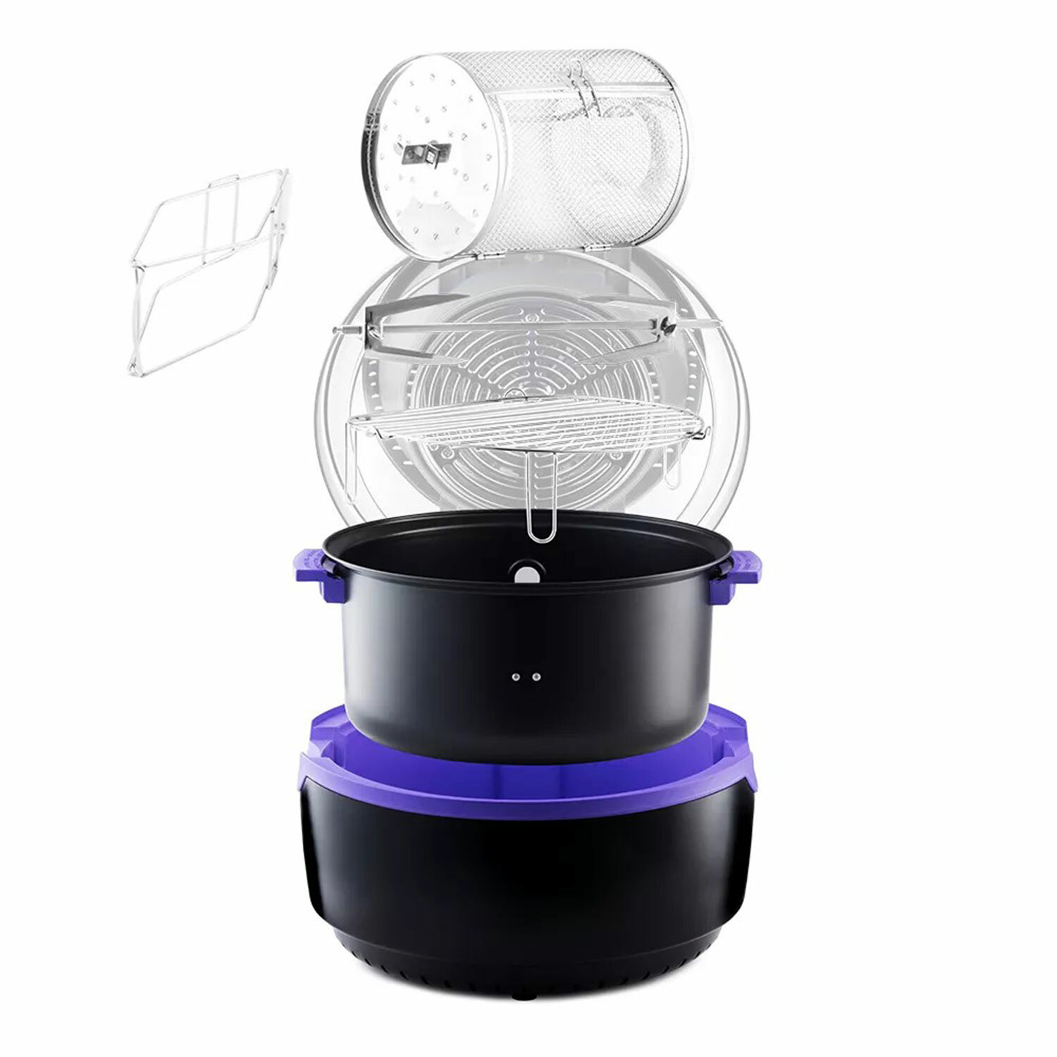 В комплекте идут полезные аксессуары: вертел для приготовления курицы целиком, решётка и вращающаяся корзина. Решётка подходит для размещения продуктов или термостойких чаш, а корзина идеальна для приготовления картошки-фри и других блюд. В центре ТЭНа расположена галогеновая лампочка, которая подсвечивает продукты, а прозрачная часть крышки позволяет наблюдать за процессом готовки.