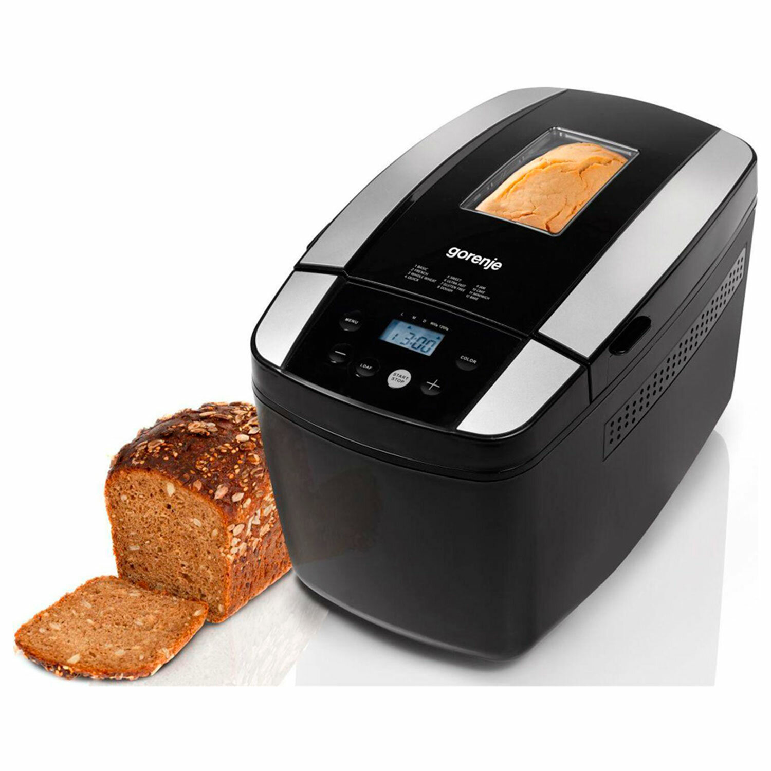 Управление хлебопечкой GORENJE BM1210BK интуитивно понятное. Кнопки расположены на крышке. Вы легко установите нужный режим. На дисплее отображается время до конца программы. Можно настроить отсрочку старта (до 13 часов). Выставьте необходимые параметры и загрузите внутрь продукты. Прибор приготовит свежую выпечку к вашему пробуждению или возвращению с работы. Об окончании готовки вас оповестит звуковой сигнал. Имеется смотровое окошко, через которое удобно наблюдать за процессом.