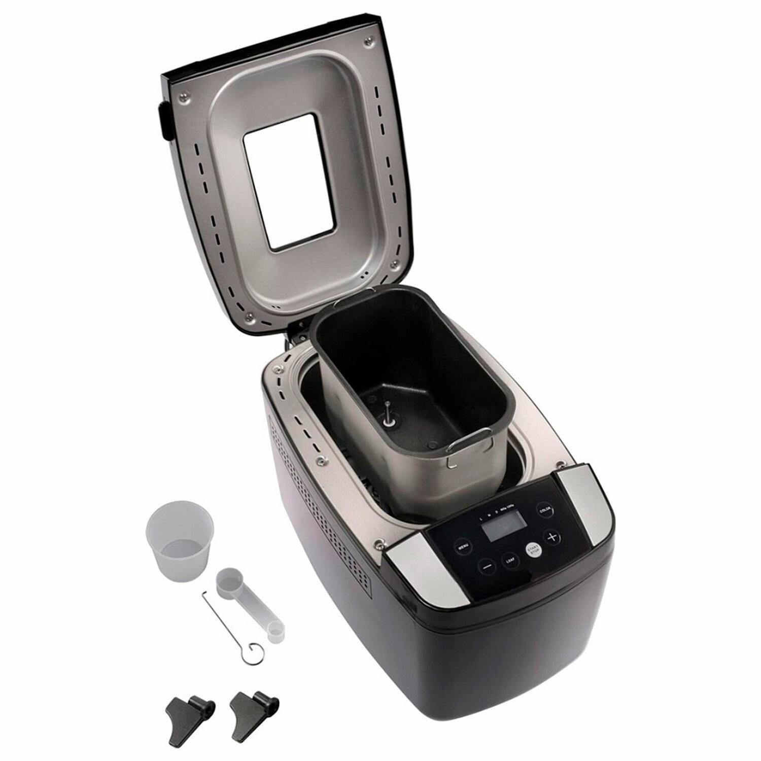 При внезапном отключении электроэнергии память устройства сохраняет программу в течение 10 минут. Если питание выключат ненадолго, вы сразу же можете вернуться к готовке. Предусмотрено автоматическое отключение (если прибор долго не используется). На основании установлены прорезиненные ножки. Устройство устойчиво располагается на любых (даже гладких) столешницах. В комплект входят форма с антипригарным покрытием, мерный стакан, мерная ложка, два тестомешателя и книга рецептов. Длина сетевого кабеля – 1,2 м. Вы легко подключите устройство к любой розетке.