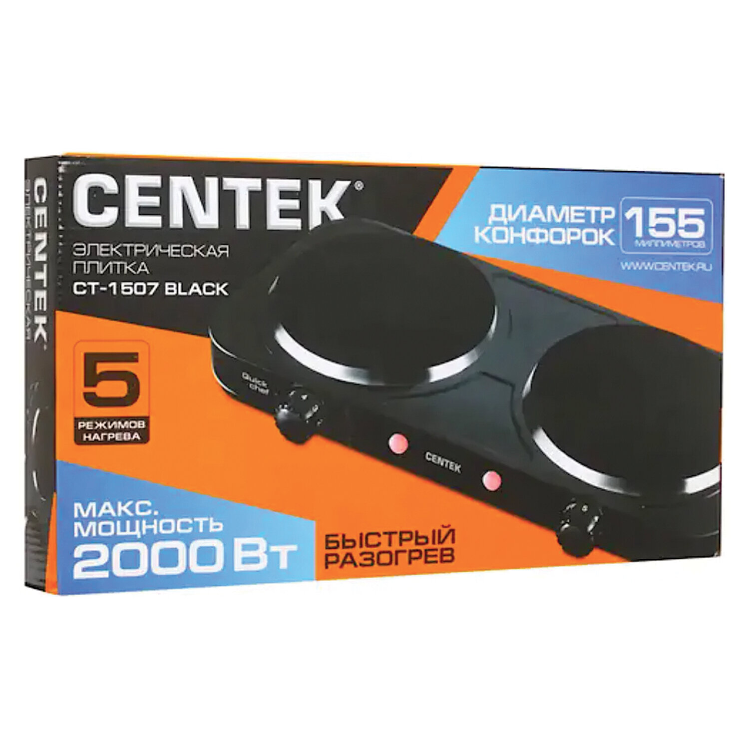 - Настольная электрическая плита CENTEK CT-1507, 2000Вт, 2 конфорки, 5 режимов нагрева, черная, CT-1507 Black