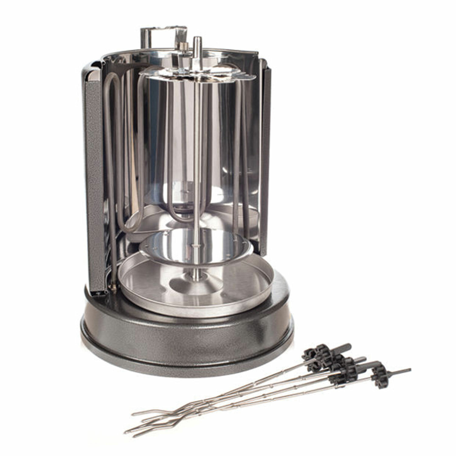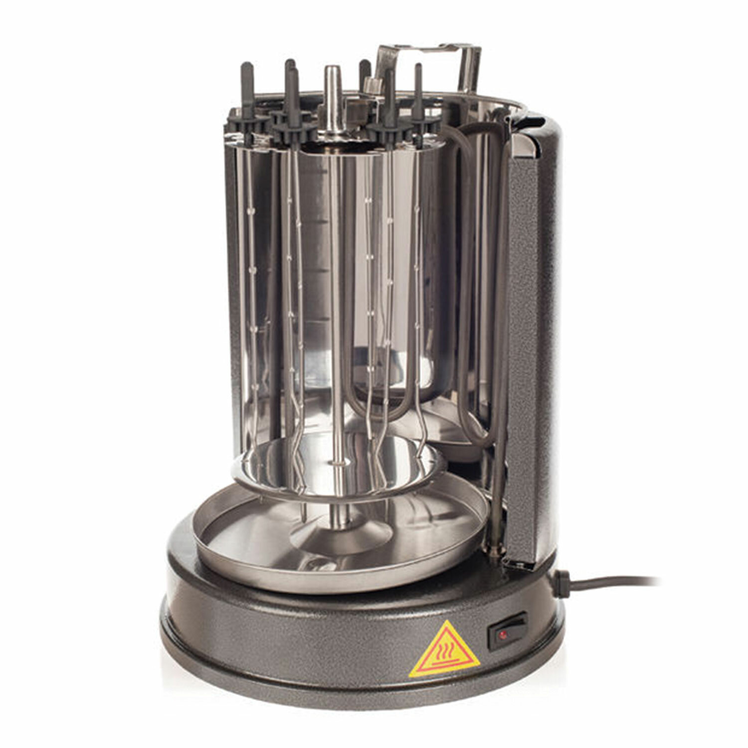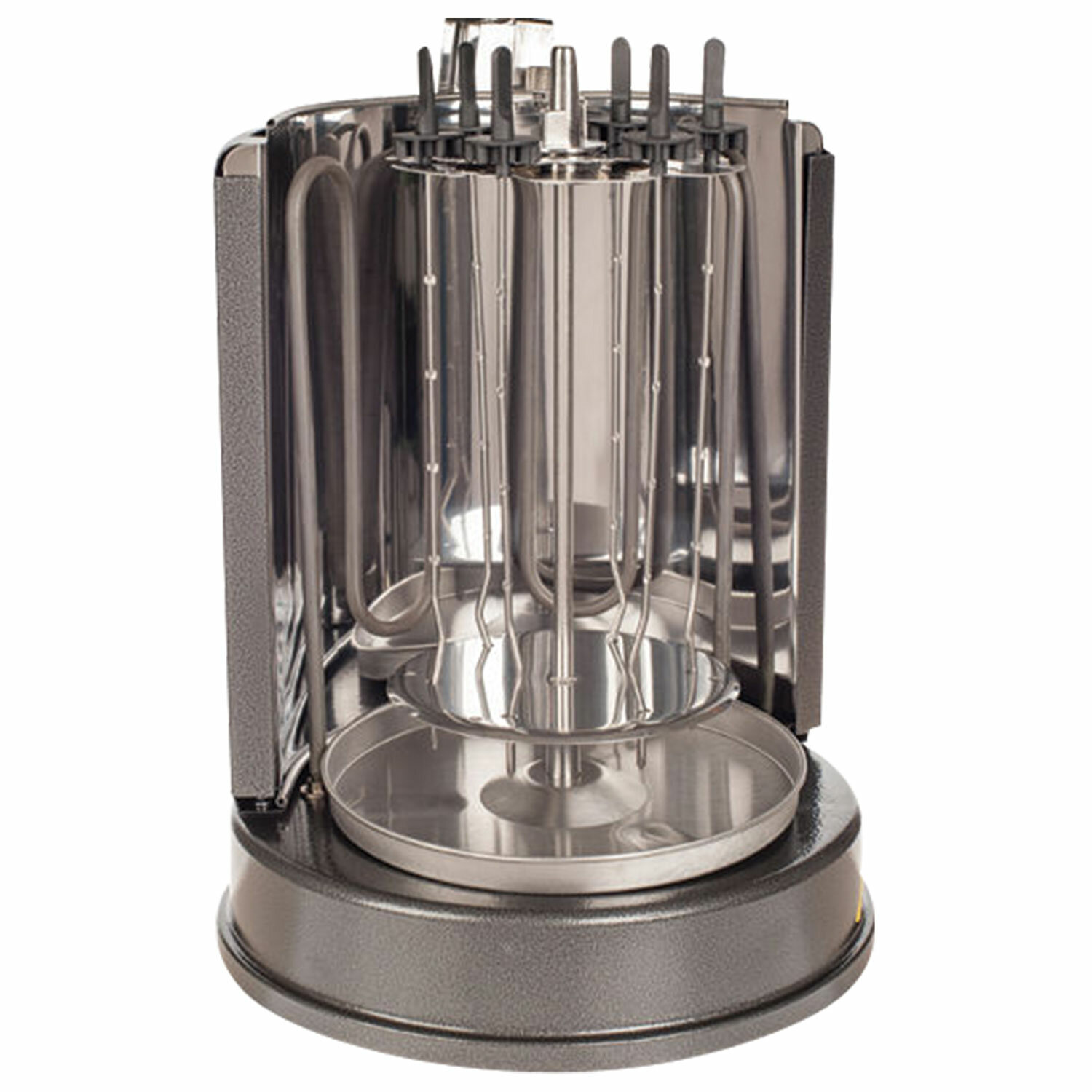Инфракрасный нагревательный элемент обеспечивает такой же нагрев, какой дают угли в обычном мангале, а автоматическое вращение шампуров позволяет мясу оставаться сочным внутри и равномерно обжаренным снаружи!