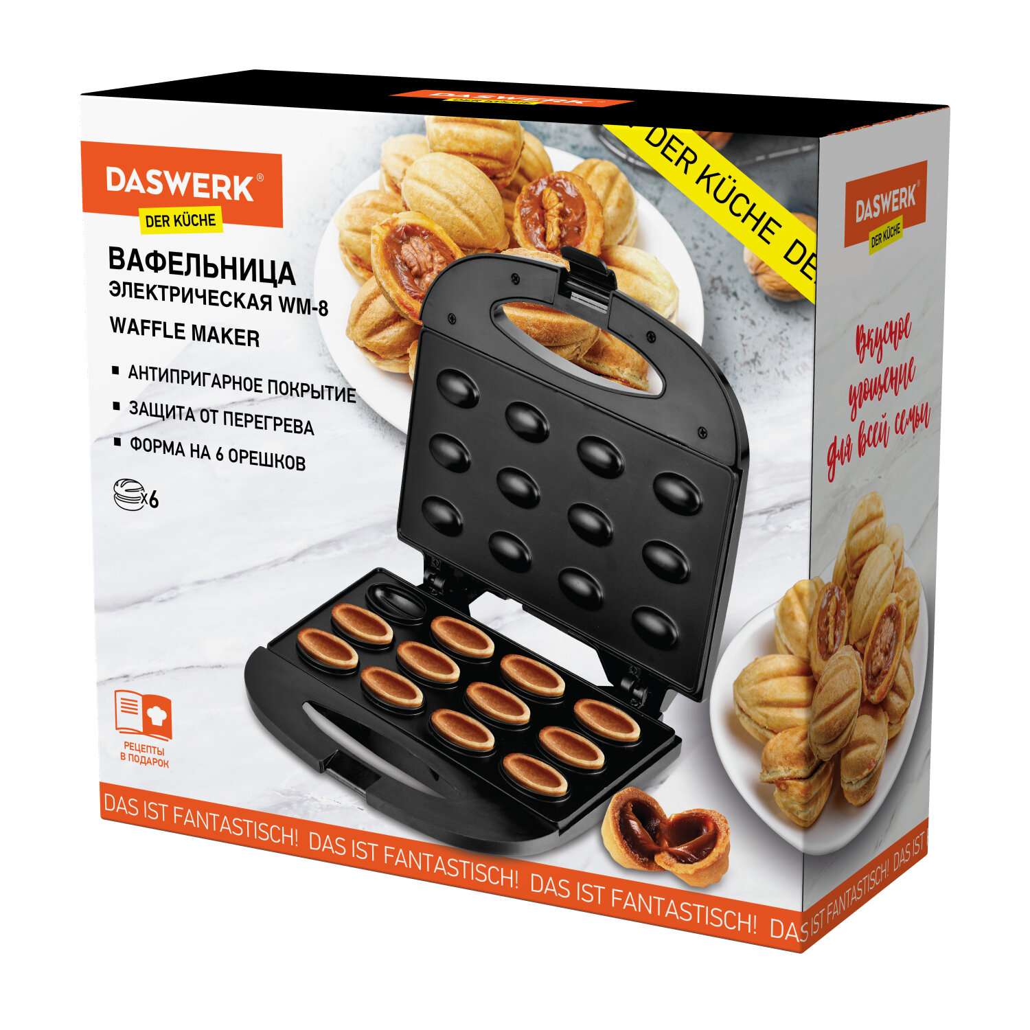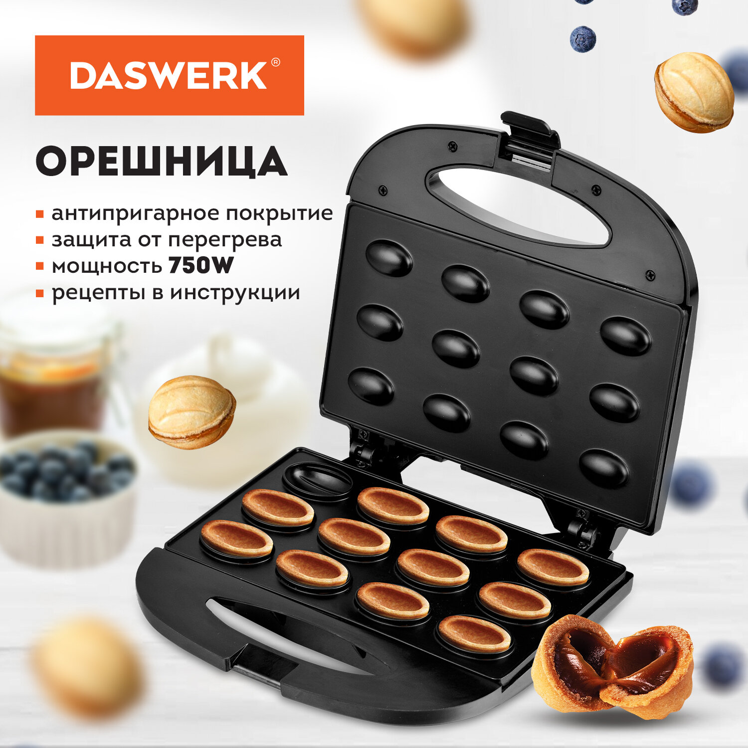 - Электровафельница-орешница антипригарная, 6 орешков, 750 Вт, DASWERK, WM-8, 455655