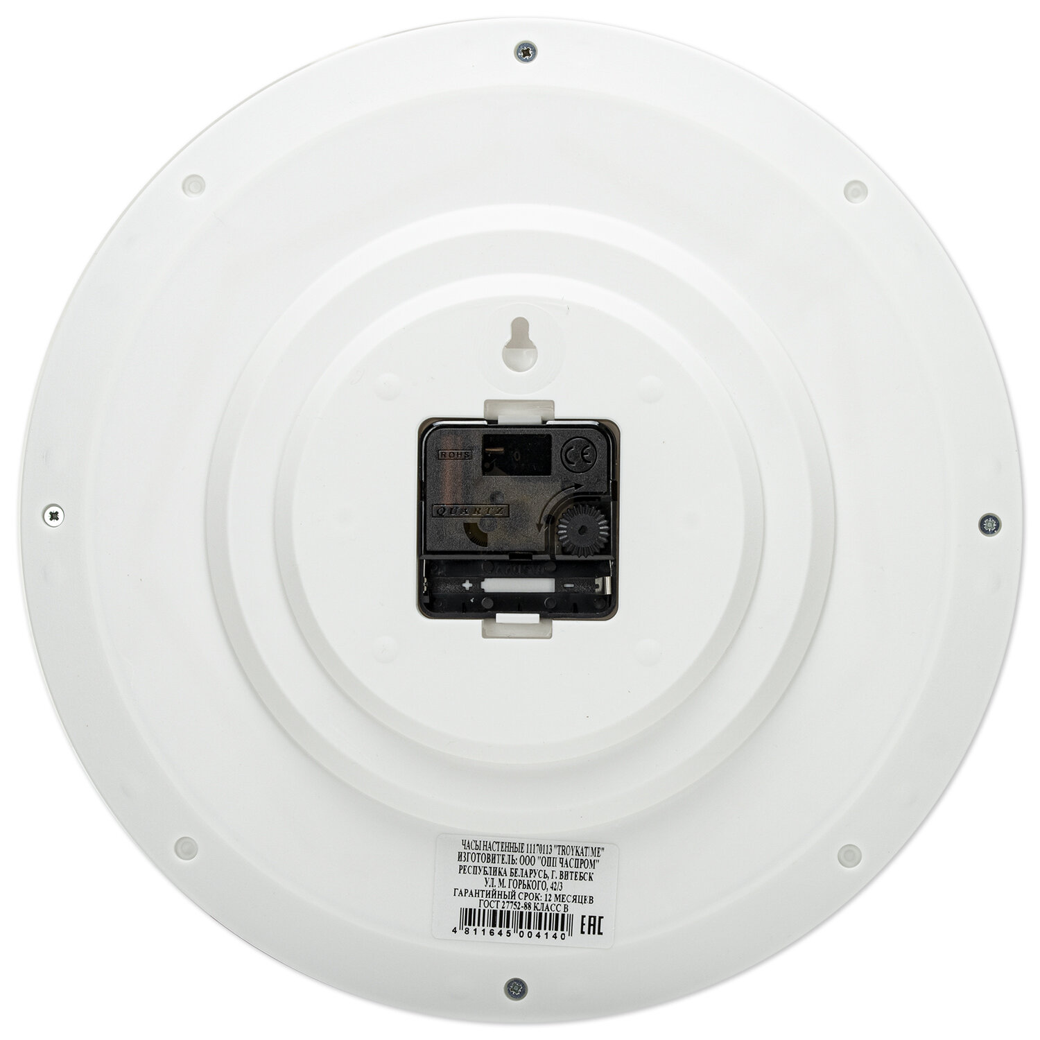 Циферблат защищен от повреждений прочным пластиковым стеклом. Часы работают от одной батарейки АА, которая не входит в комплект. Часы настенные TROYKATIME (TROYKA) 11170113, круг, белые, серебристая рамка, 29х29х3,5 см