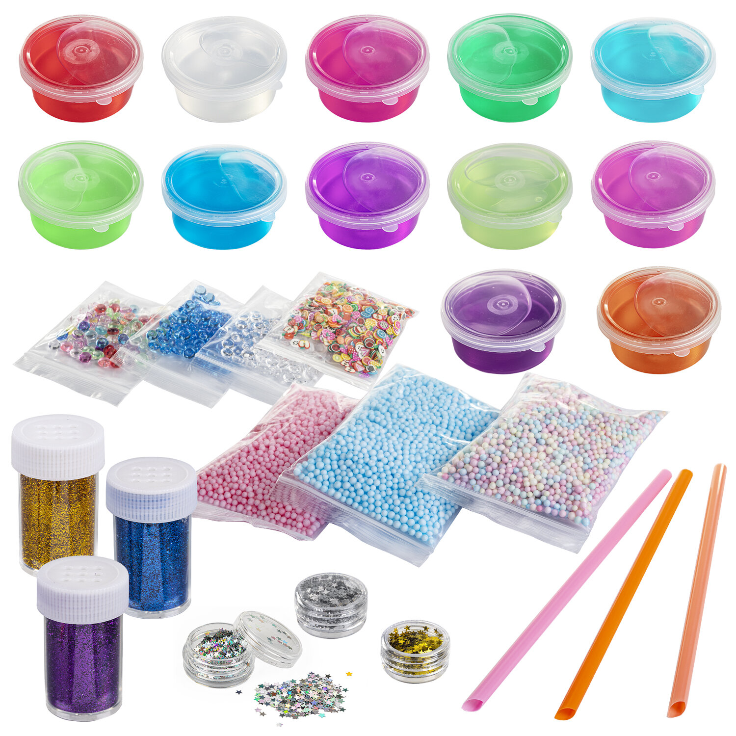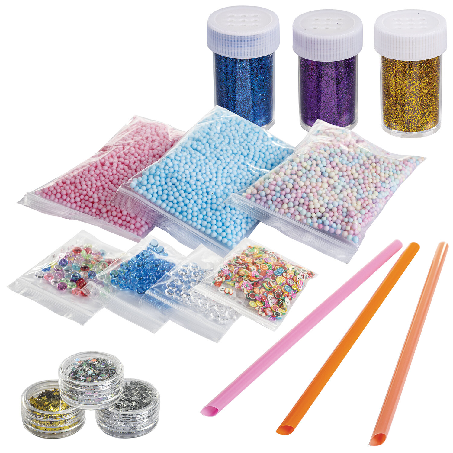 В набор входят 12 слаймов в баночках весом 50-55 грамм, 3 пакетика с пенопластовыми шариками различных цветов, 1 пакетик с пластиковыми фруктиками, 3 пакетика с бусинами, 3 тубы с блёстками различных цветов, 3 баночки с блестящими звездочками, а также трубочки для надувания слаймов.