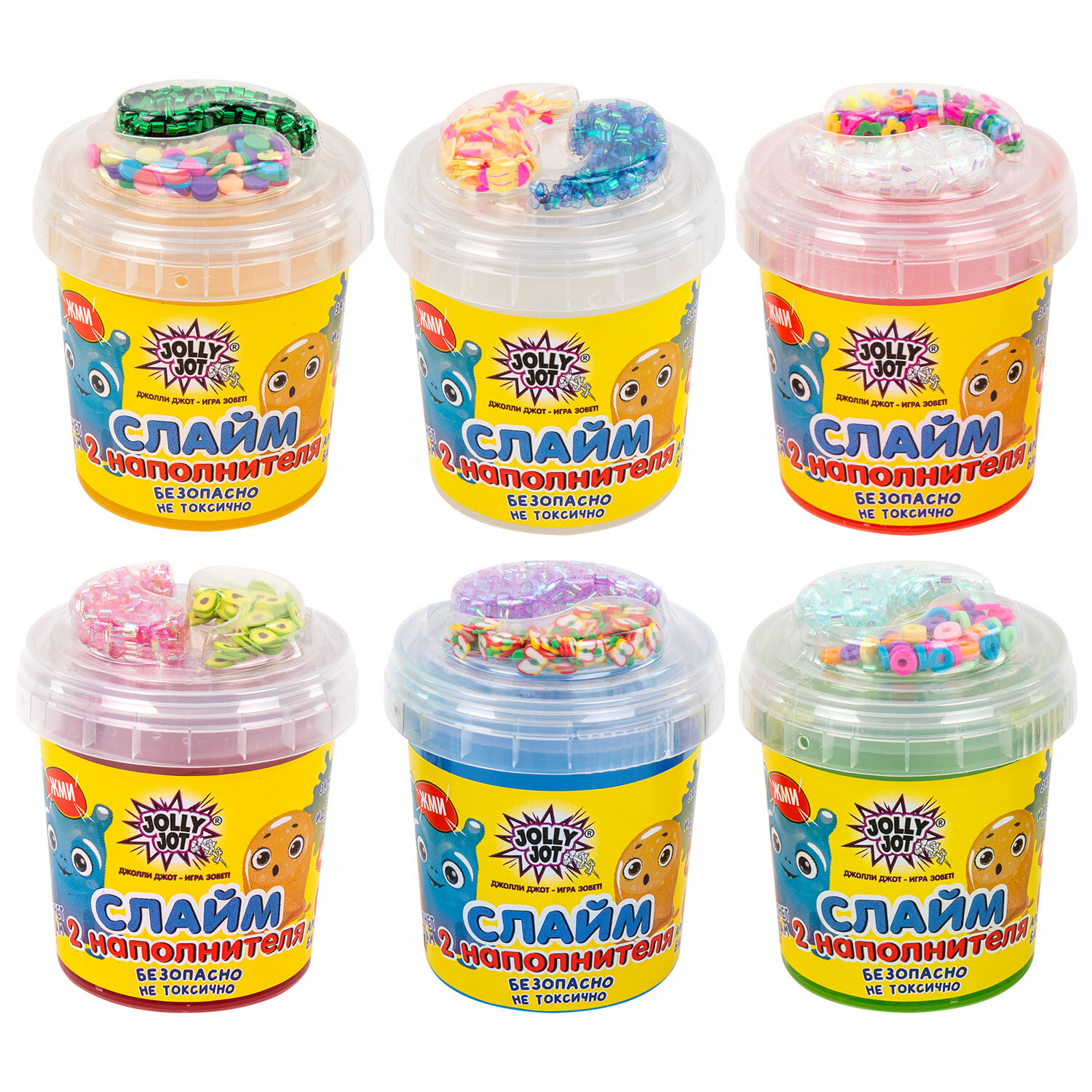 Представлено 6 видов слаймов (2 наполнителя в каждом) без возможности выбора. Слайм (лизун) с наполнителями МИКС, 140 г, ассорти 6 видов, JOLLY JOT (ДЖОЛИ ДЖОТ), 665950