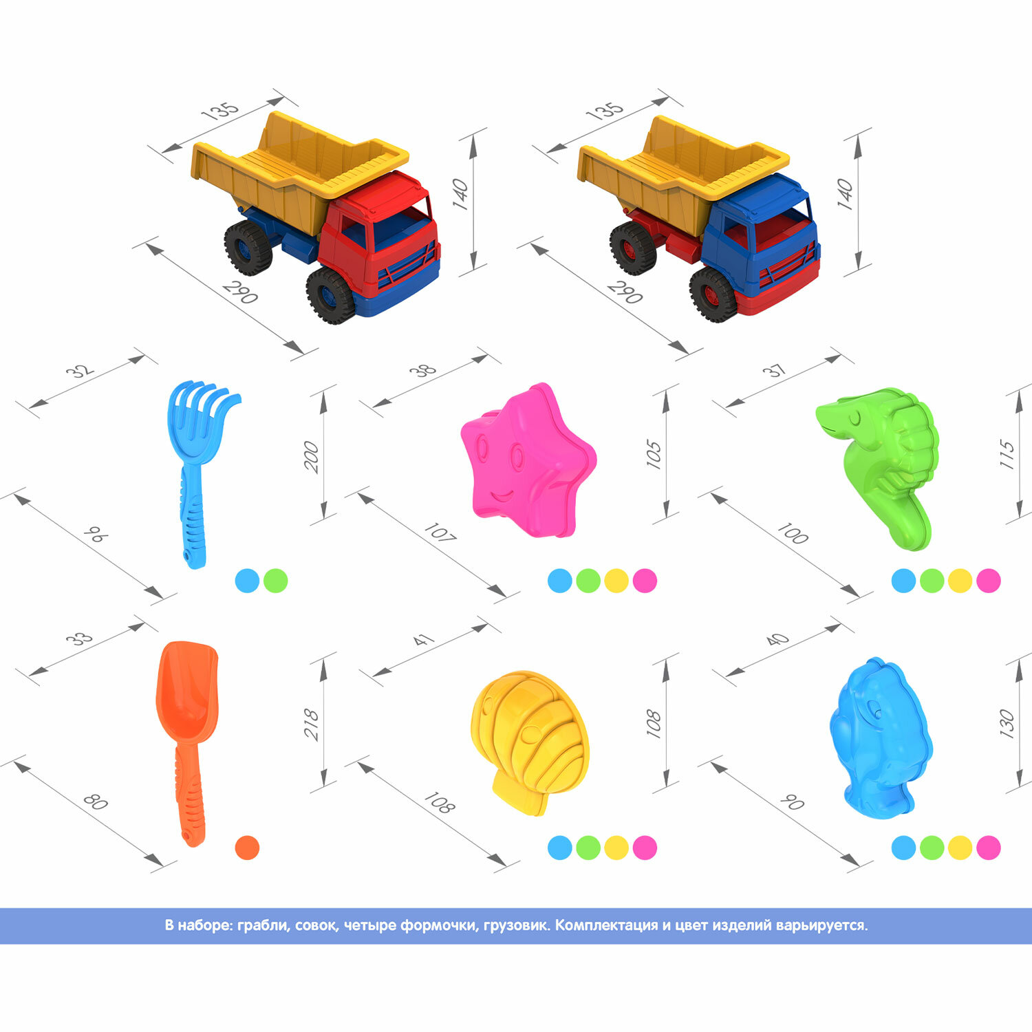 Комплектация: совок, грабли, ведро, грузовик t;Медвежонокt;, 4 формочки t;Морской миксt;.