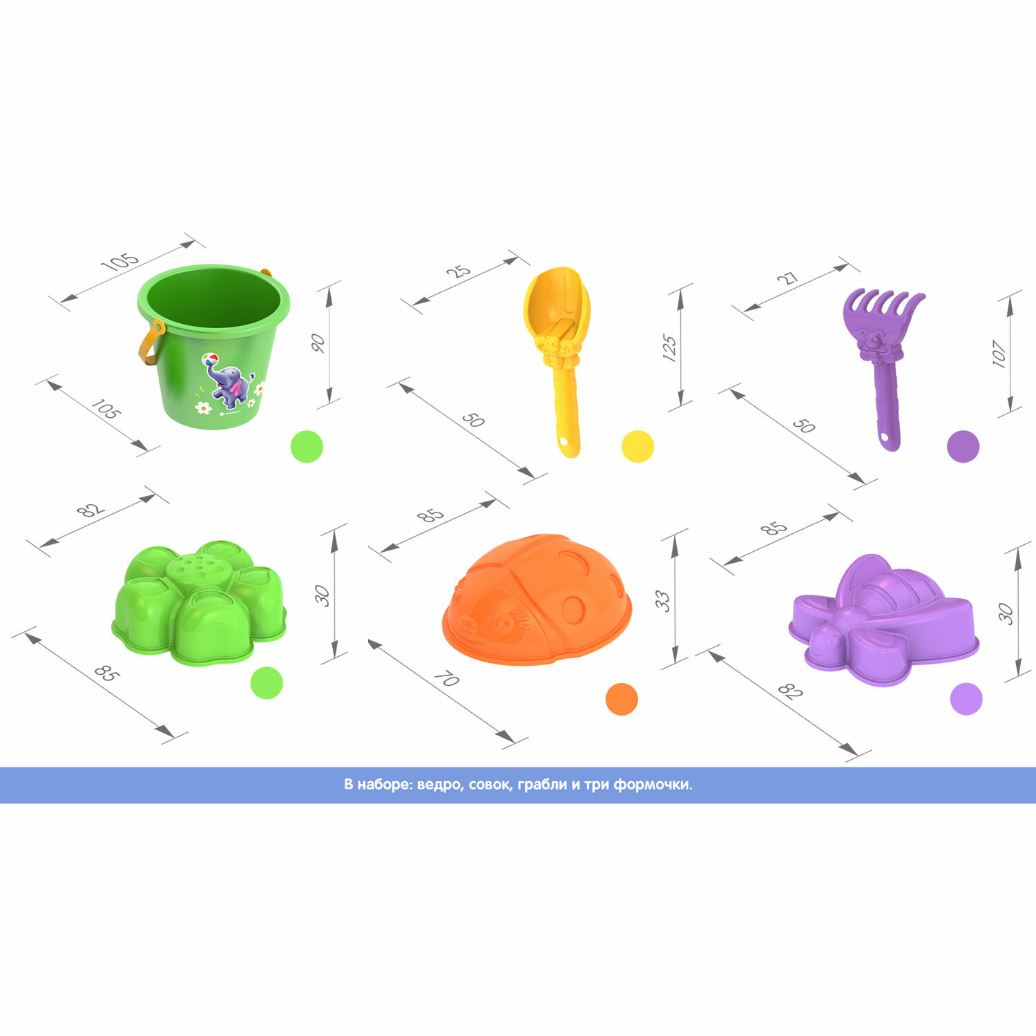 Комплектация: совочек, грабельки и ведерко, 2 цветные формочки (божья коровка и пчёлка или божья коровка и цветочек).