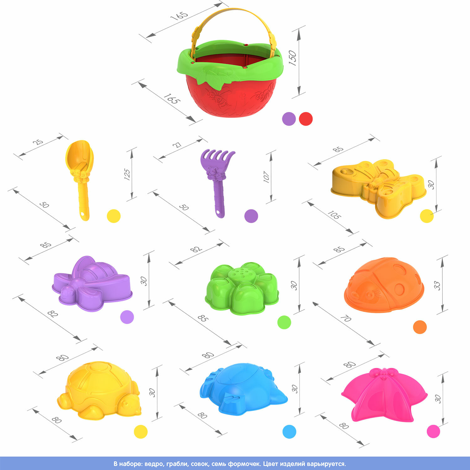 Комплектация: совок, грабли, 7 формочек (морская звезда, черепашка, рыбка, божья коровка, цветочек, пчелка и бабочка), ведерко t;Букашкаt;.