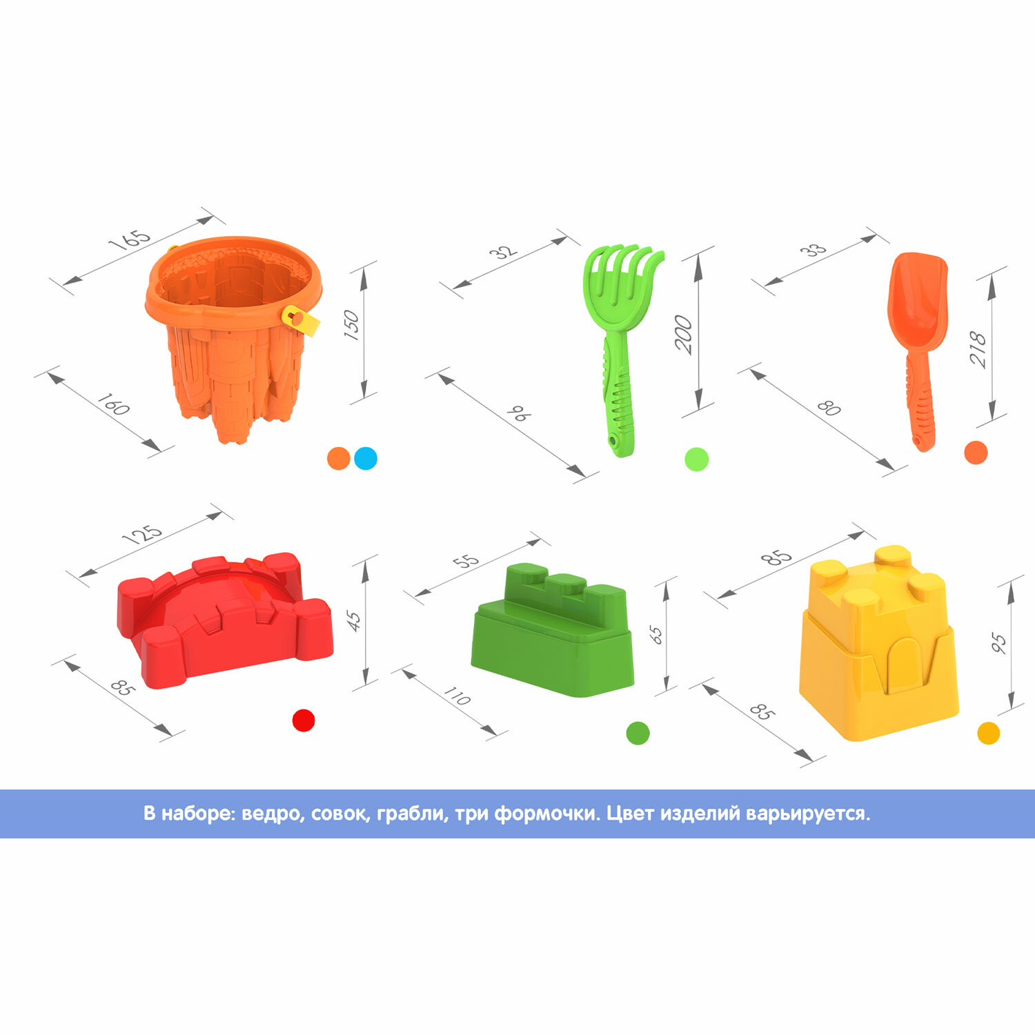 Комплектация: ведро t;Замокt;, грабли t;Волнаt;, совок t;Волнаt;, 3 формочки t;Крепостьt;.