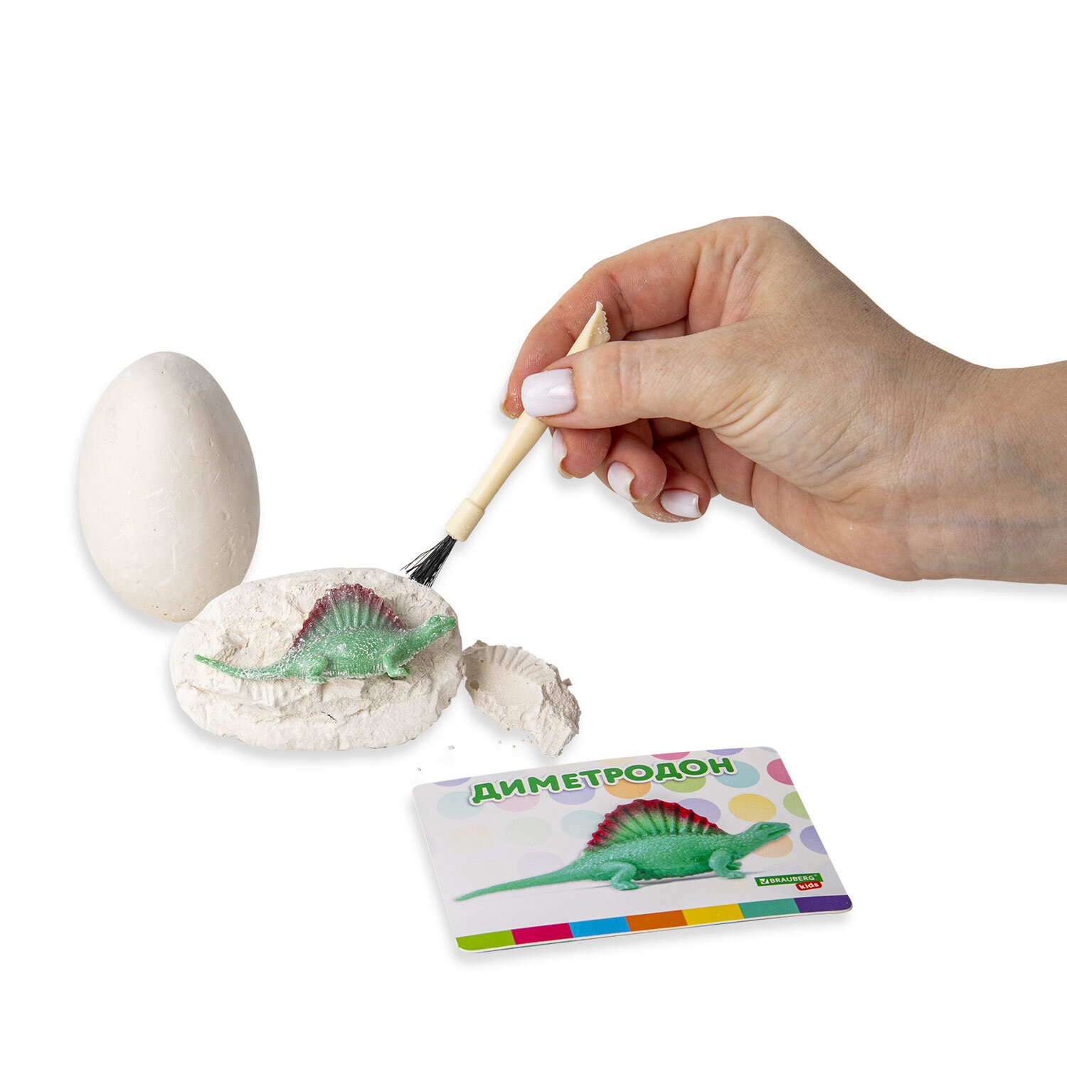 В набор входят 12 гипсовых блоков яйцевидной формы с динозаврами внутри, 12 инструментов для проведения раскопок (долото с кисточкой), 12 красочных двусторонних карточек с информацией о каждом динозавре из набора.