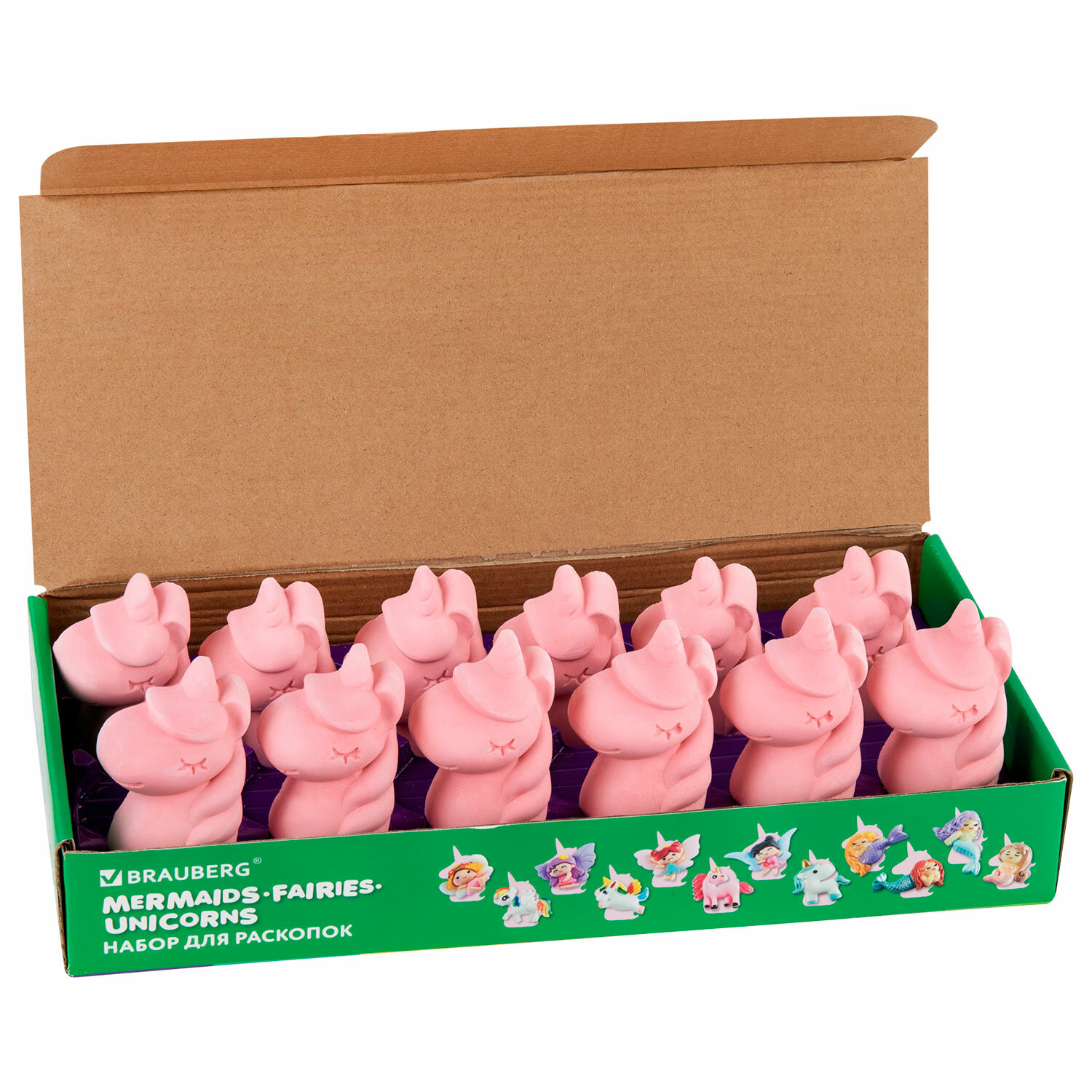 В набор входят 12 гипсовых блоков в форме единорога с разными сказочными существами внутри, 12 инструментов для проведения раскопок (долото с кисточкой), 1 красочный постер с легендами о феях, русалках и единорогах.