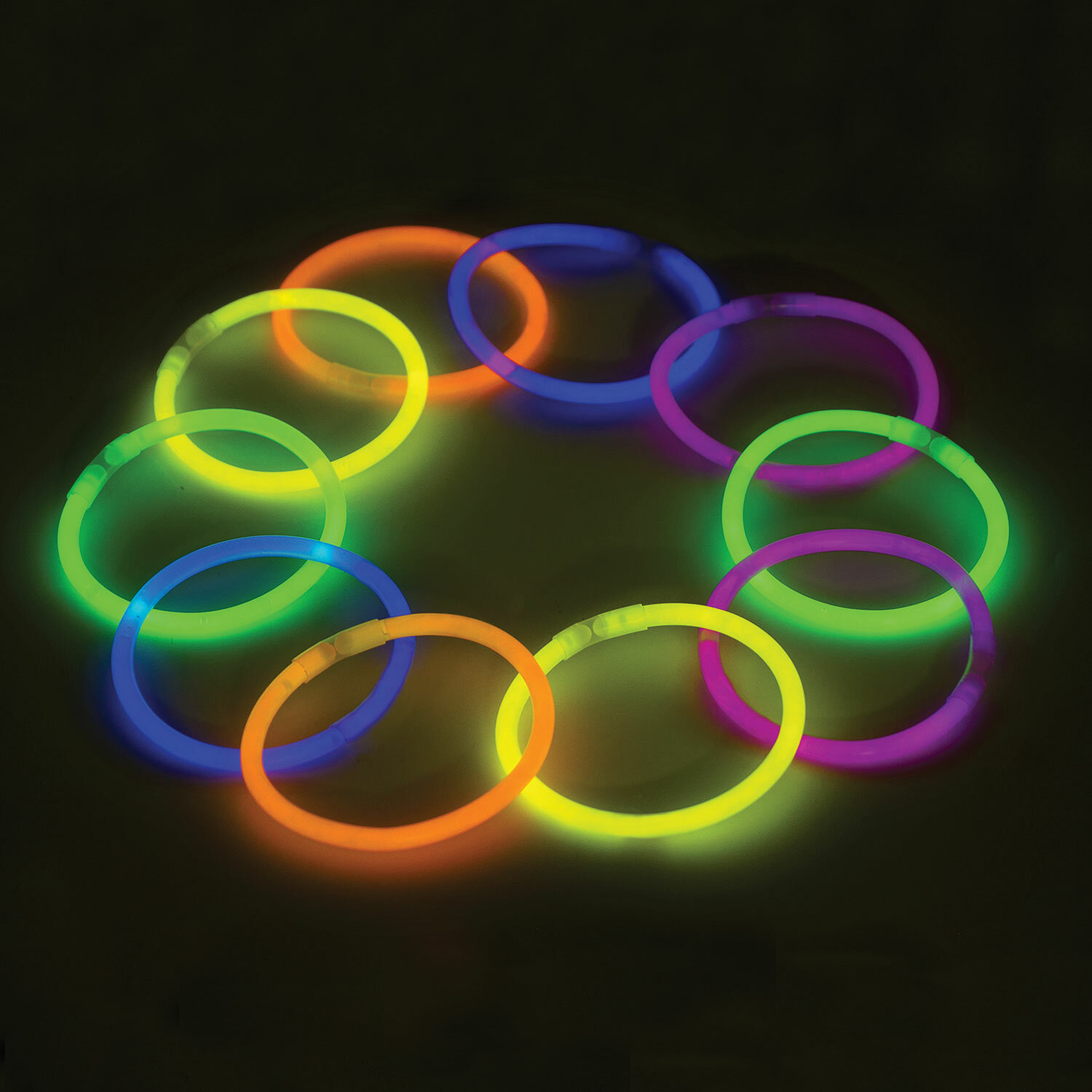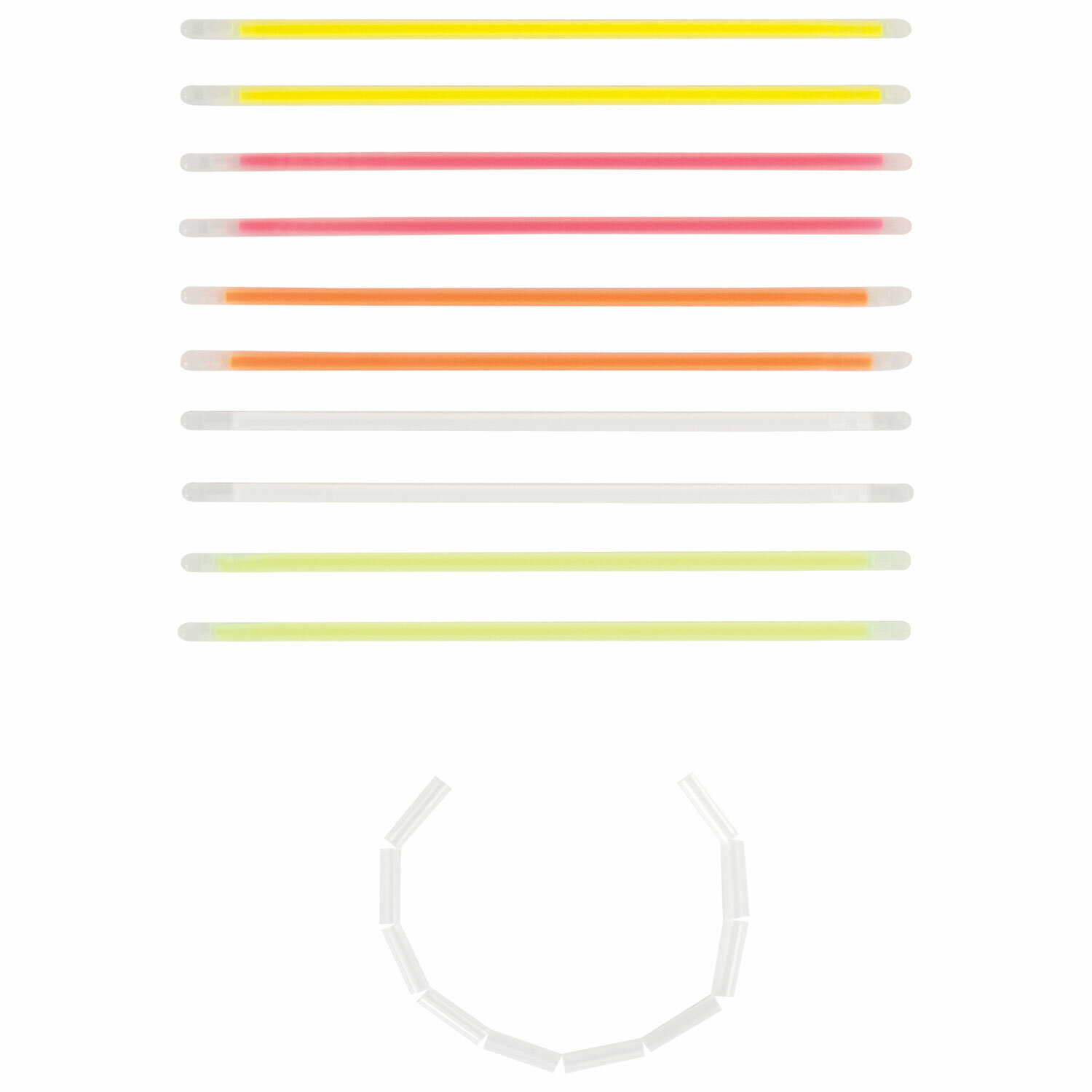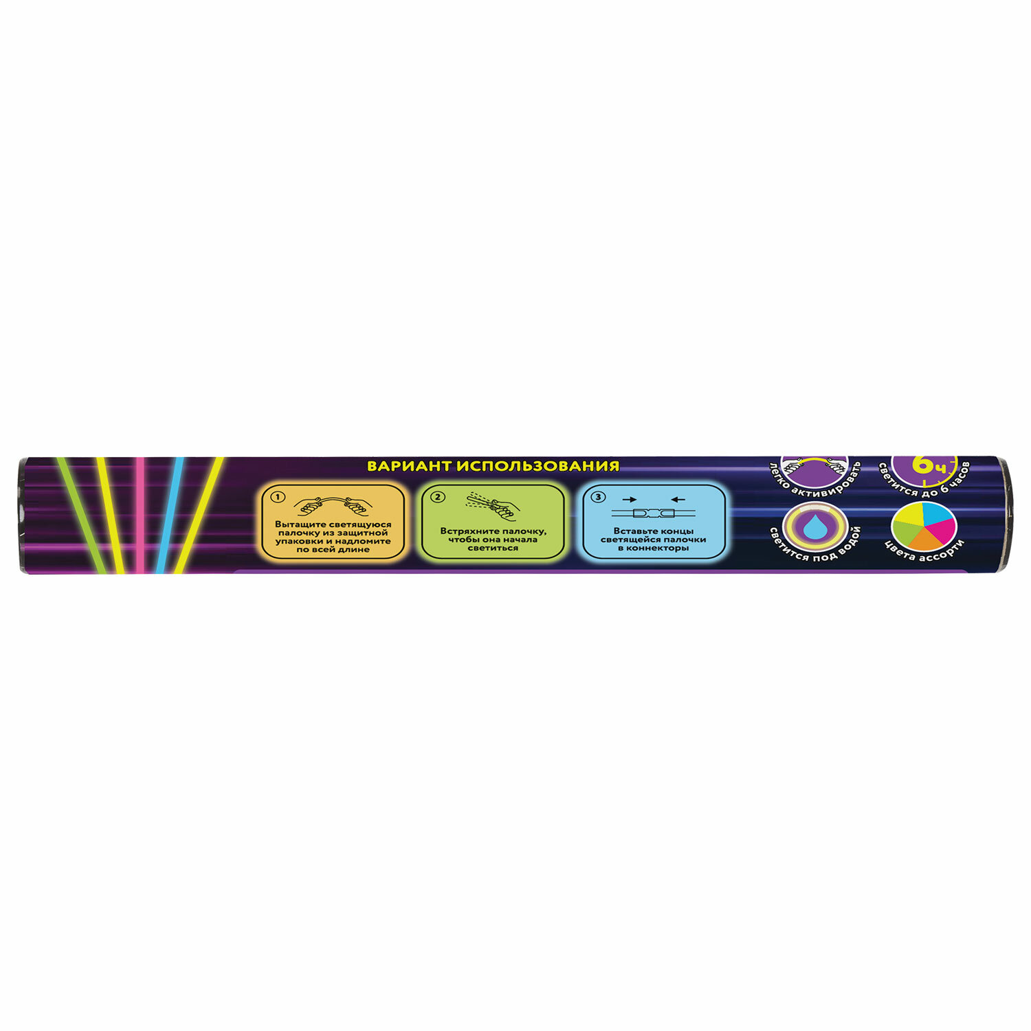 Дают неоновое свечение пяти разных цветов. Палочки водонепроницаемые и могут быть использованы в дождливую погоду и даже под водой на небольшой глубине. Светятся до 6 часов. Для активации палочку следует надломить в нескольких местах и тщательно потрясти, чтобы сделать свечение более равномерным. Вставив оба конца палочки в коннектор, можно сделать яркий браслет.